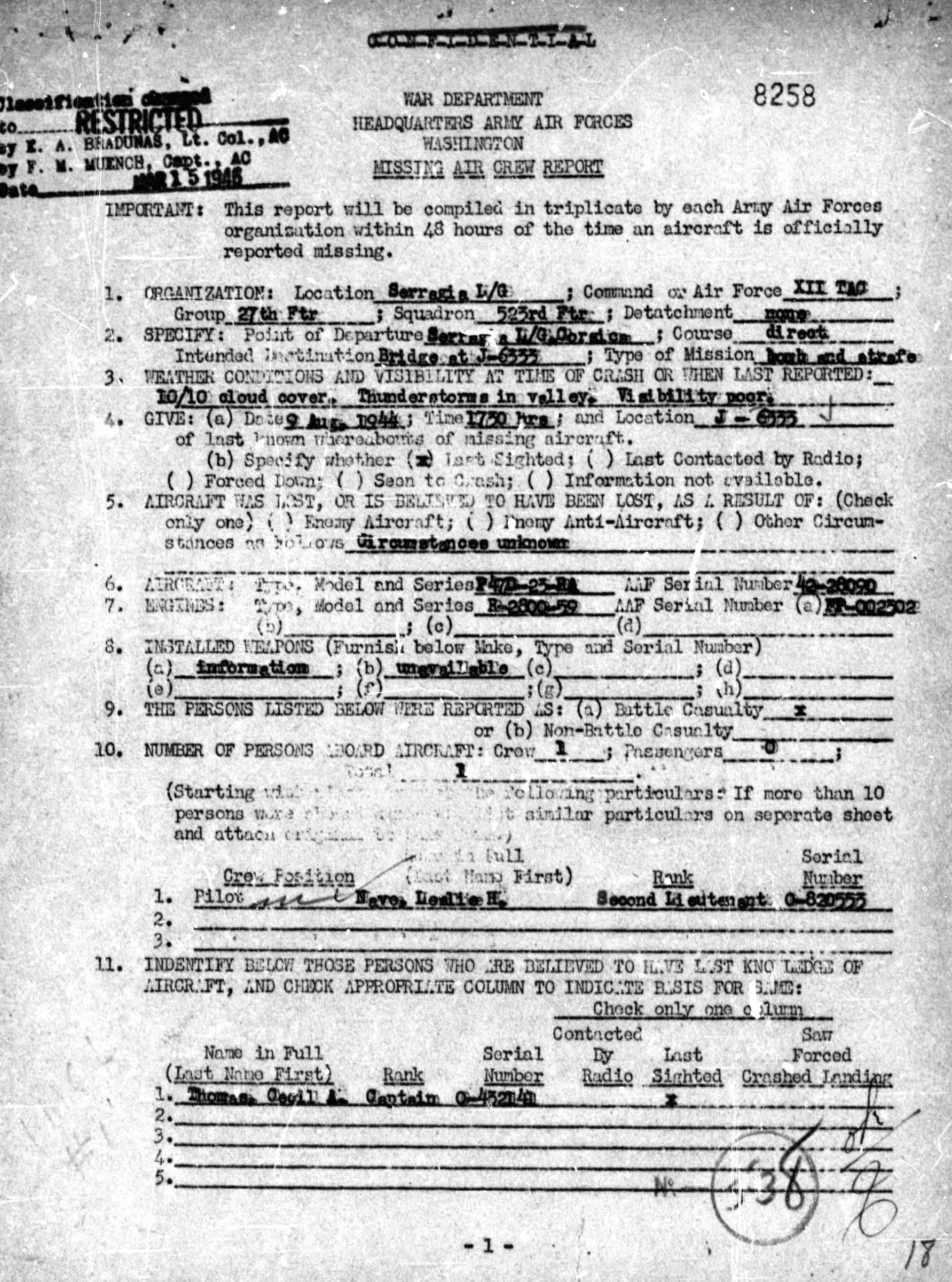At approximately 1725 hours, prior to the attack on the target, he entered a cloud bank. He was separated from his flight leader, Captain Cecil A. Thomas. He crashed 3 Km East of Villanova, near Casale-Monferrate.