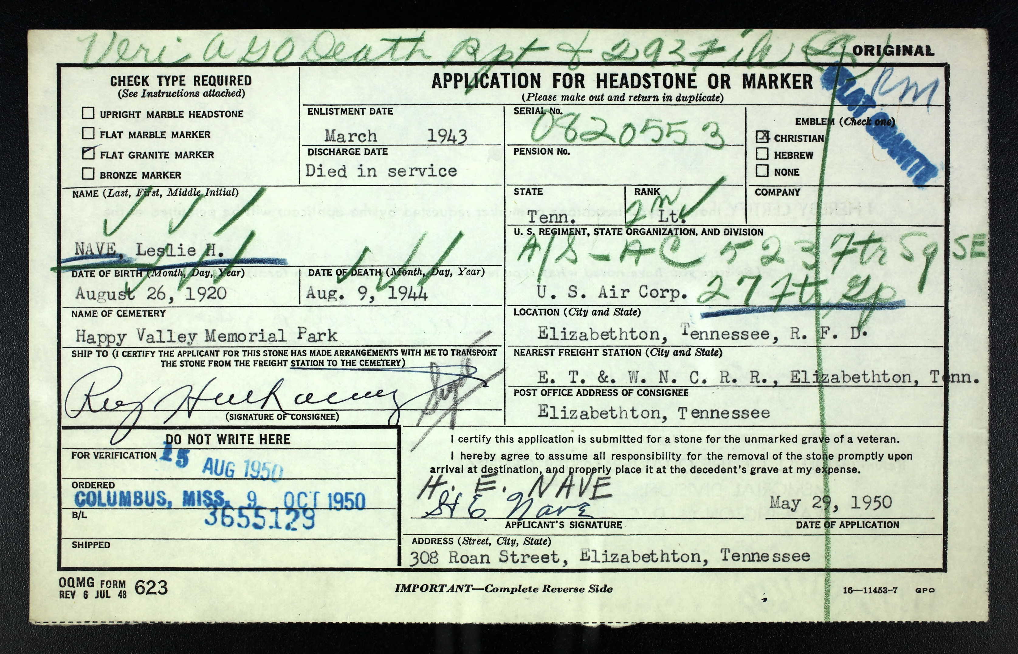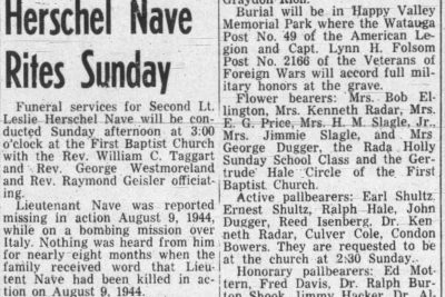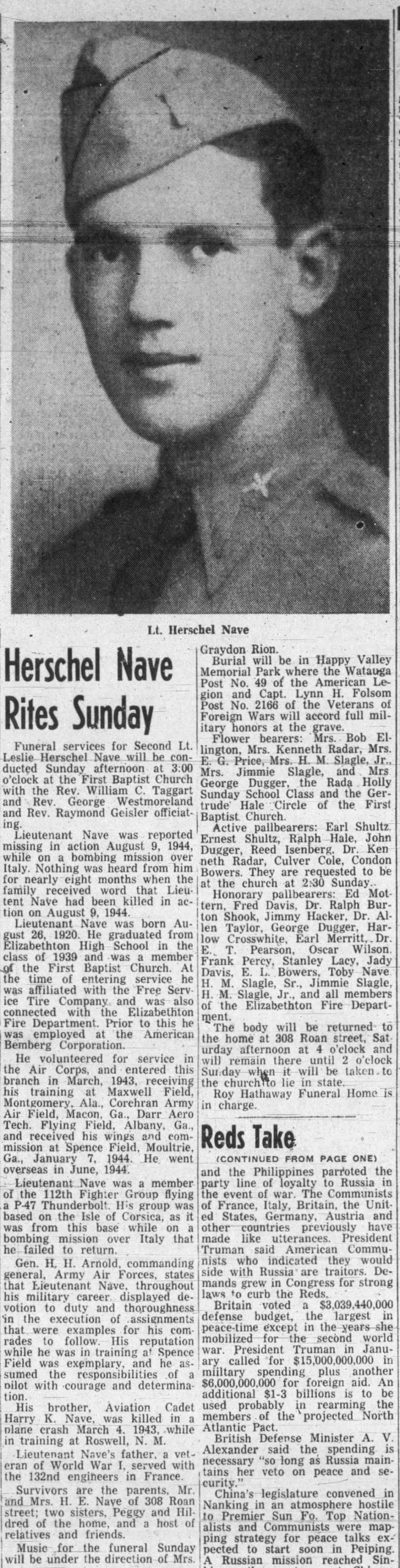 Funeral services for Second Lt. Leslie Herschel Nave will be conducted at the First Baptist Church. Lieutenant Nave was reported missing in action August 9, 1944, while on a bombing mission over Italy. Nothing was heard from him for nearly eight months when the family received word that Lieutenant Nave had been killed in action on August 9, 1944. Lieutenant Nave was born August 26, 1920. He graduated from Elizabethton High School in the class of 1939 and was a member of the First Baptist Church. At the time of entering service he was affiliated with the Free Service Tire Company and was also connected with the Elizabethton Fire Department. Prior to this he was employed at the American Bemberg Corporation. He volunteered for service in the Air Corps, and entered this branch in March, 1943, receiving his training at Maxwell Field, Montgomery, Ala., Cochran Army Air Field, Macon, Ga., Darr Aero Tech. Flying Field, Albany, Ga., and received his wings and commission at Spence Field, Moultrie, Ga., January 7, 1944. He went overseas in June, 1944. Lieutenant Nave was a member of the 112th Fighter Group flying a P-47 Thunderbolt. His group was based on the Isle of Corsica, as it was from this base while on a bombing mission over Italy that he failed to return.