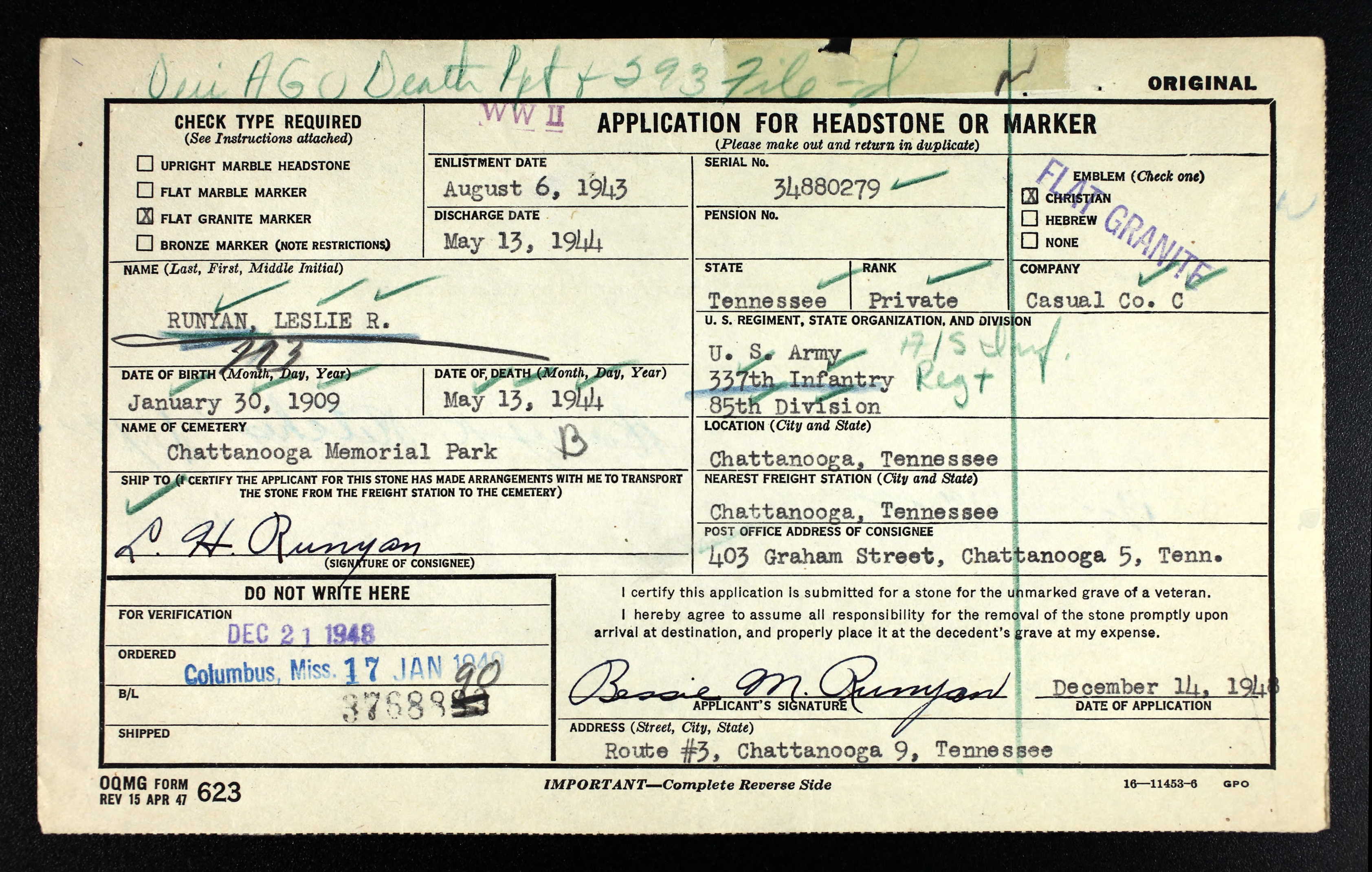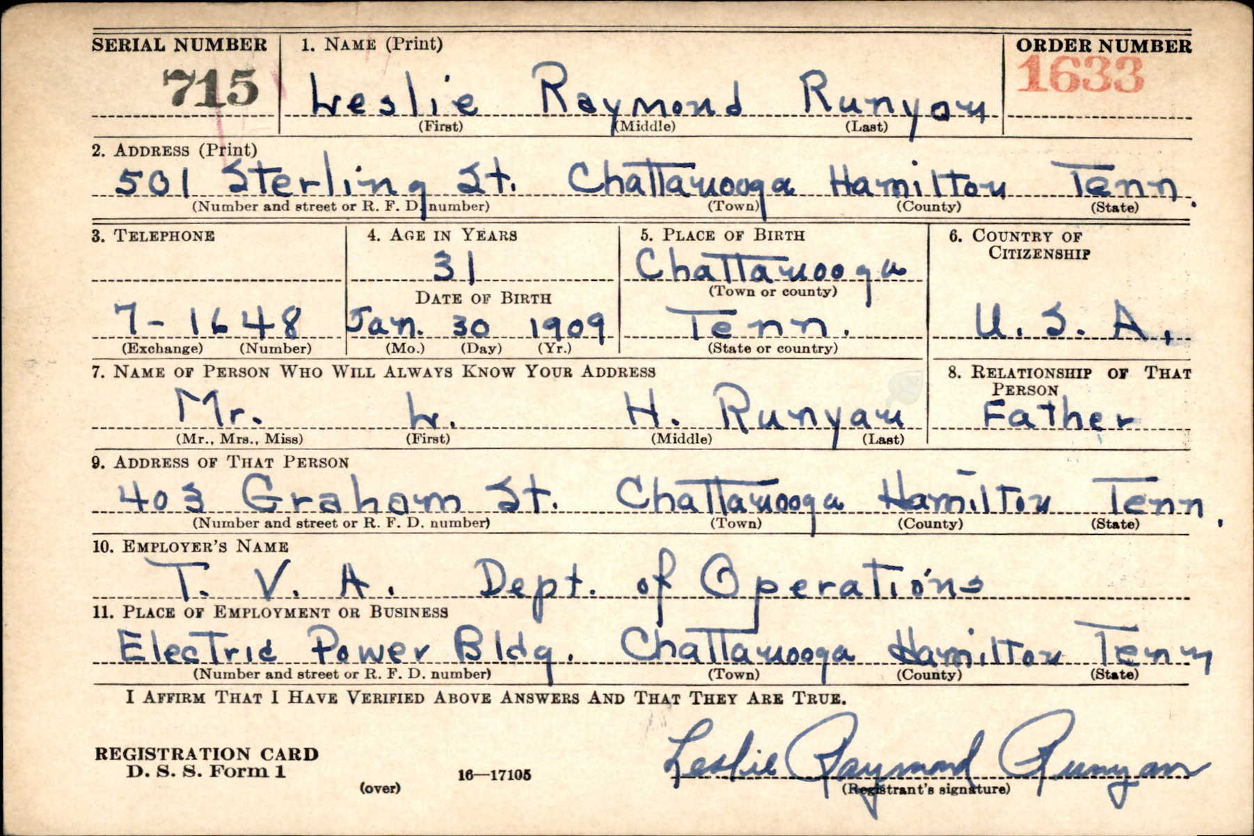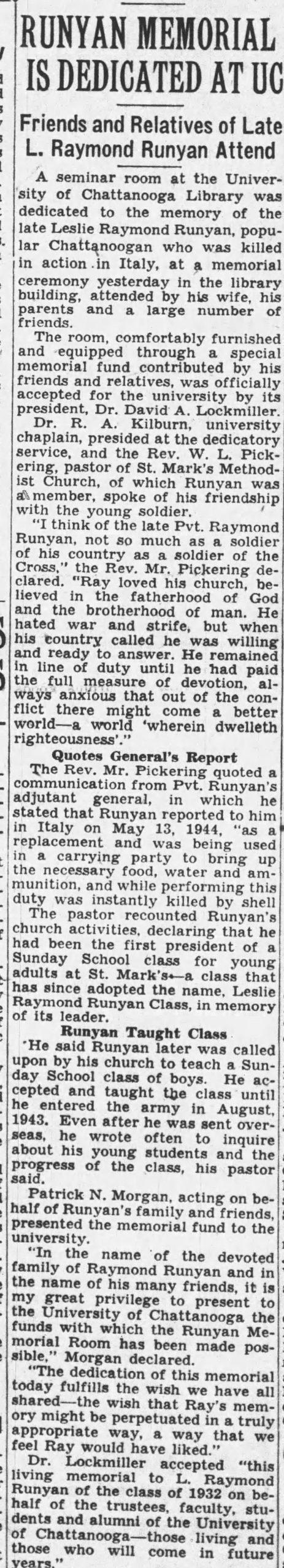 Pvt. Leslie Raymond Runyan, 35, son of Mr. and Mrs. Leslie H. Runyan, 403 Graham Avenue, and husband of Mrs. Bessie Runyan, was killed in action in Italy May 13, his family was informed yesterday by the War Department. Pvt Runyan, who had been a statistician here with the Tennessee Valley Authority for about nine years before entering the army last August, went overseas last February. His last letter to his wife, also employed by the TVA, was written from “somewhere in Italy” on May 13, the day he died. He was a graduate of Central High School and the University of Chattanooga. He was a member of St. Mark’s Methodist Church. His father said a telegram from he War Department informed the family of his son’s death was received yesterday, with the information that a letter concerning details would follow soon.