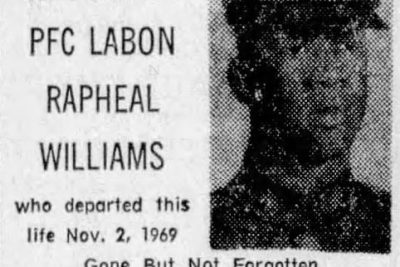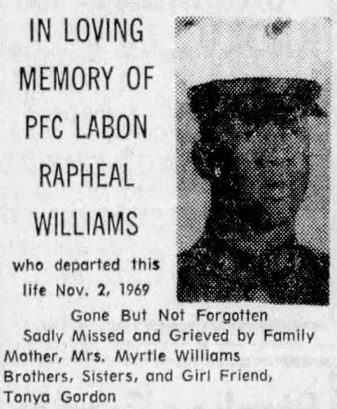Pfc. Labon R. Williams, a 19 year old Knoxville Marine, was killed in Vietnam Nov. 2, his family has learned. Pfc. Williams died after a hand grenade exploded near him while he was on bridge security patrol in the Quang Nam Province. He was on patrol duty, and the family was told that the grenade was booby trapped to explode.