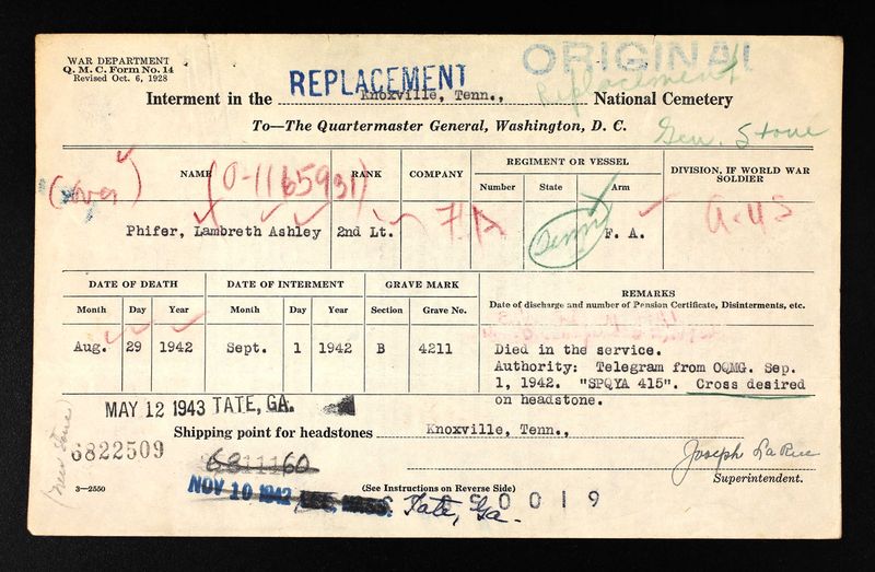 Lieutenant Lambreth Ashley Phifer was the son of Mrs. Zula Phifer of 2023 Forest Avenue. Lambreth was a member of Forest Avenue Christian Church and was an officer in the ROTC at Knoxville High School when he graduated in 1938. He was a student at the University of Tennessee for two years and entered the Army through the National Guard; receiving his commission at Fort Sill, Oklahoma. Lt. Phifer was killed when his jeep he was driving overturned in Little Rock, Arkansas.
