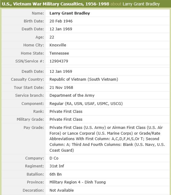 Private First Class Larry Grant Bradley was born February 20, 1946. He was a member of McCalla Avenue Baptist Church and the son of Mr. and Mrs. Con L. Bradley of Knoxville. His tour in Vietnam began in November of 1968 with the 9th Infantry, and he was killed January 12, 1969, in Dinh Tuong, South Vietnam. In addition to his parents, he was survived by a daughter, and two siblings. He was buried at Greenwood Cemetery, Knoxville, TN.
