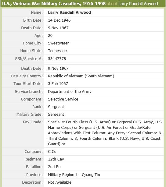 Son of Mr. & Mrs. James R. Arwood of Sweetwater and husband of Mrs. Linda Fisher Arwood. He had spent three months in Japan recovering from wounds he received in June in Vietnam. A graduate of Sweetwater High School in 1966, where he was a fooball player.