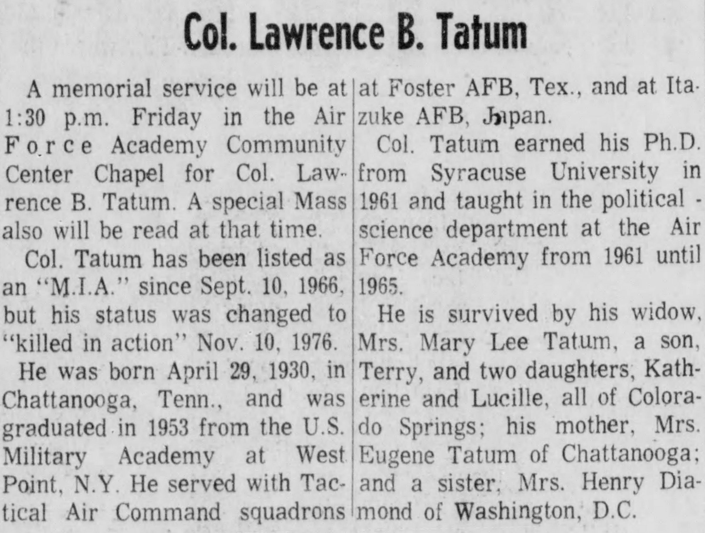 Colonel Lawrence Byron Tatum was a distinguished graduate of the USMA in the Class of 1953. Originally listed as MIA on 9-10-1966. He was believed for some time to be a POW but this was never substantiated and he was finally officially declared deceased on 11-10-1976. Know as one of the fines of USAF Flyers he may well have gone on to a long and illustrious career. He was awarded the Purple Heart posthumously.