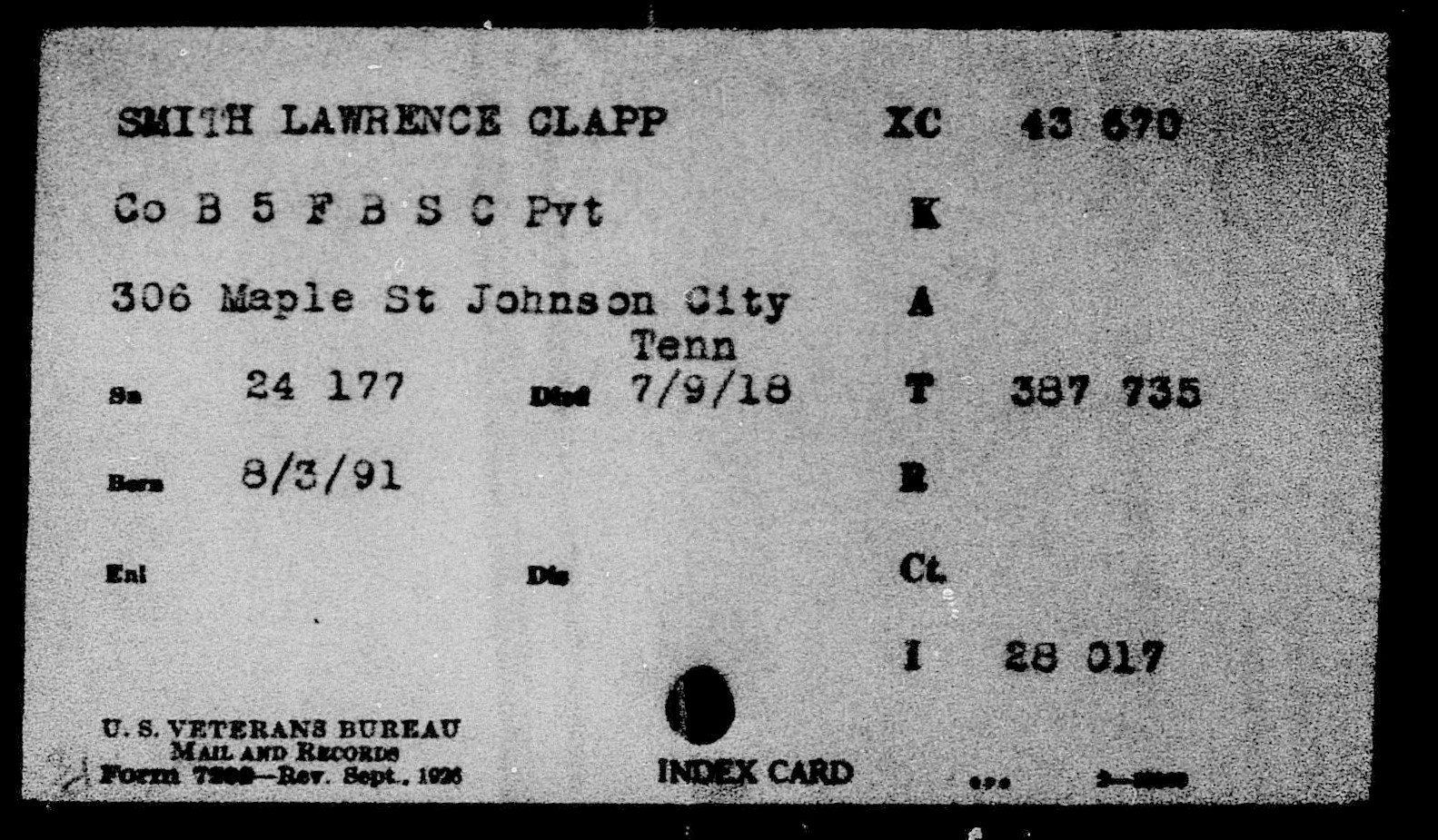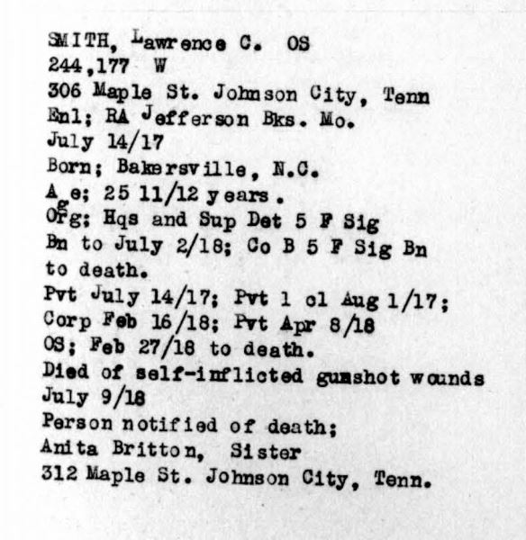 Lawrence completed his Registration Form in Corning on 5 June 1917, but still listed his home address as Johnson City, Tennessee. He also stated on the card that he was born in 1891, but his memorial marker in Johnson City reflects 1890. Lawrence enlisted in the United States Army on 14 July 1917 at Jefferson Barracks, Missouri with service number 244177 as a Private.
