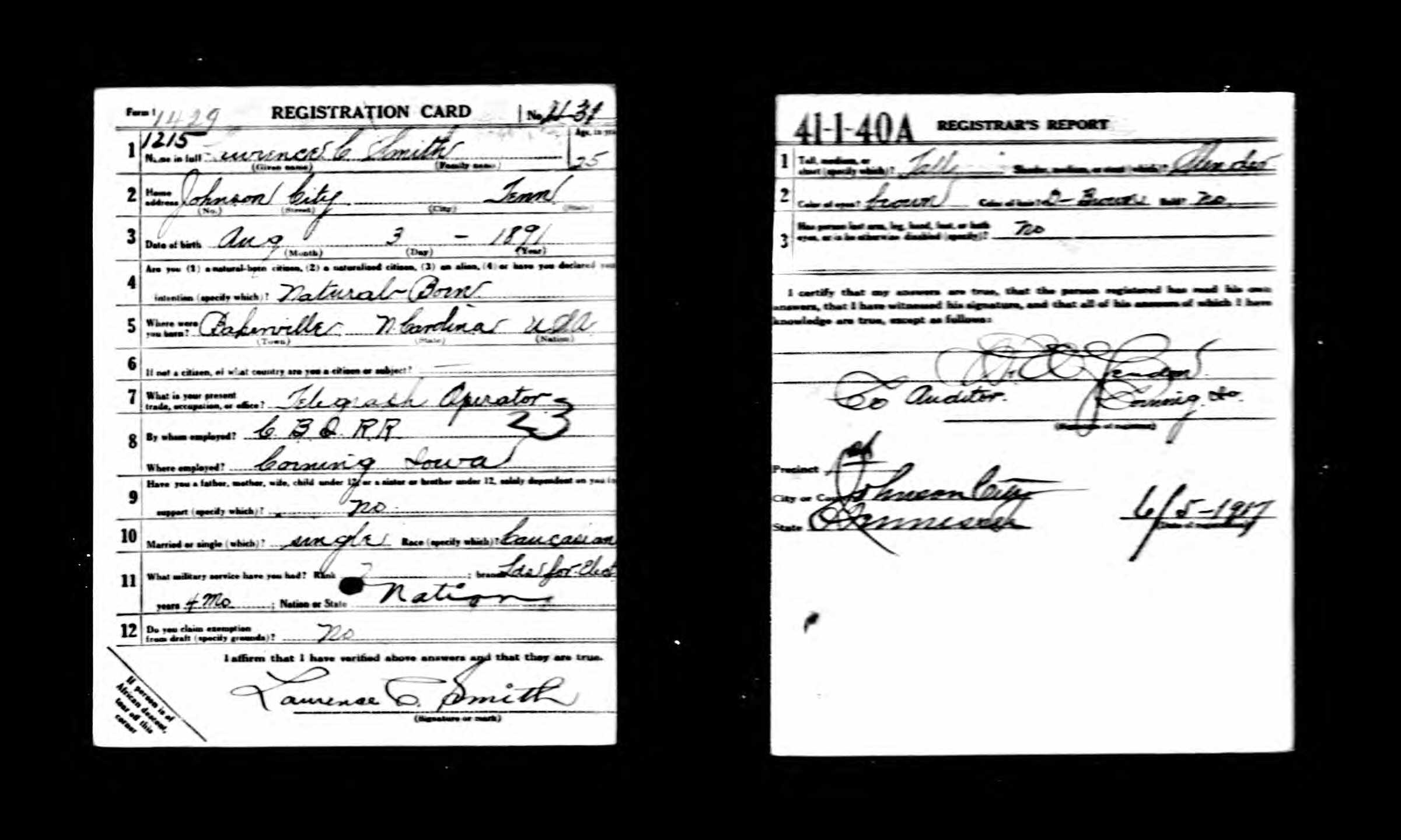 Lawrence Clapp Smith called Johnson City, Washington County, Tennessee home and graduated from high school here. He studied Telegraphy and became a Telegraph Operator for the Western Union and in time was put in charge of the Johnson City office. He moved in early 1917 to Corning, Adams County, Iowa and worked again as a Telegraph Operator, but this time for the Chicago, Burlington and Quincy Railroad.