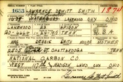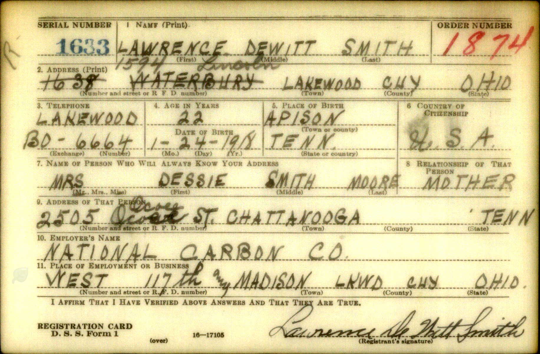 Lawrence Dewitt Smith was born at Apison, Tennessee to Leonard Kelly Smith and Dessie Mosteller.
