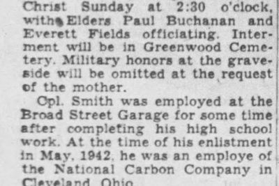 Cpl. Smith was employed at the Broad Street Garage for some time after completing his high school work. At the time of his enlistment in May, 1942, he was an employee of the National Carbon Company in Cleveland, Ohio. The 27-year-old infantryman arrived overseas in June, 1944 and was assigned to Company A, 48th Armored Infantry Battalion, with which he served until killed in action. He was first interred in Belgium.