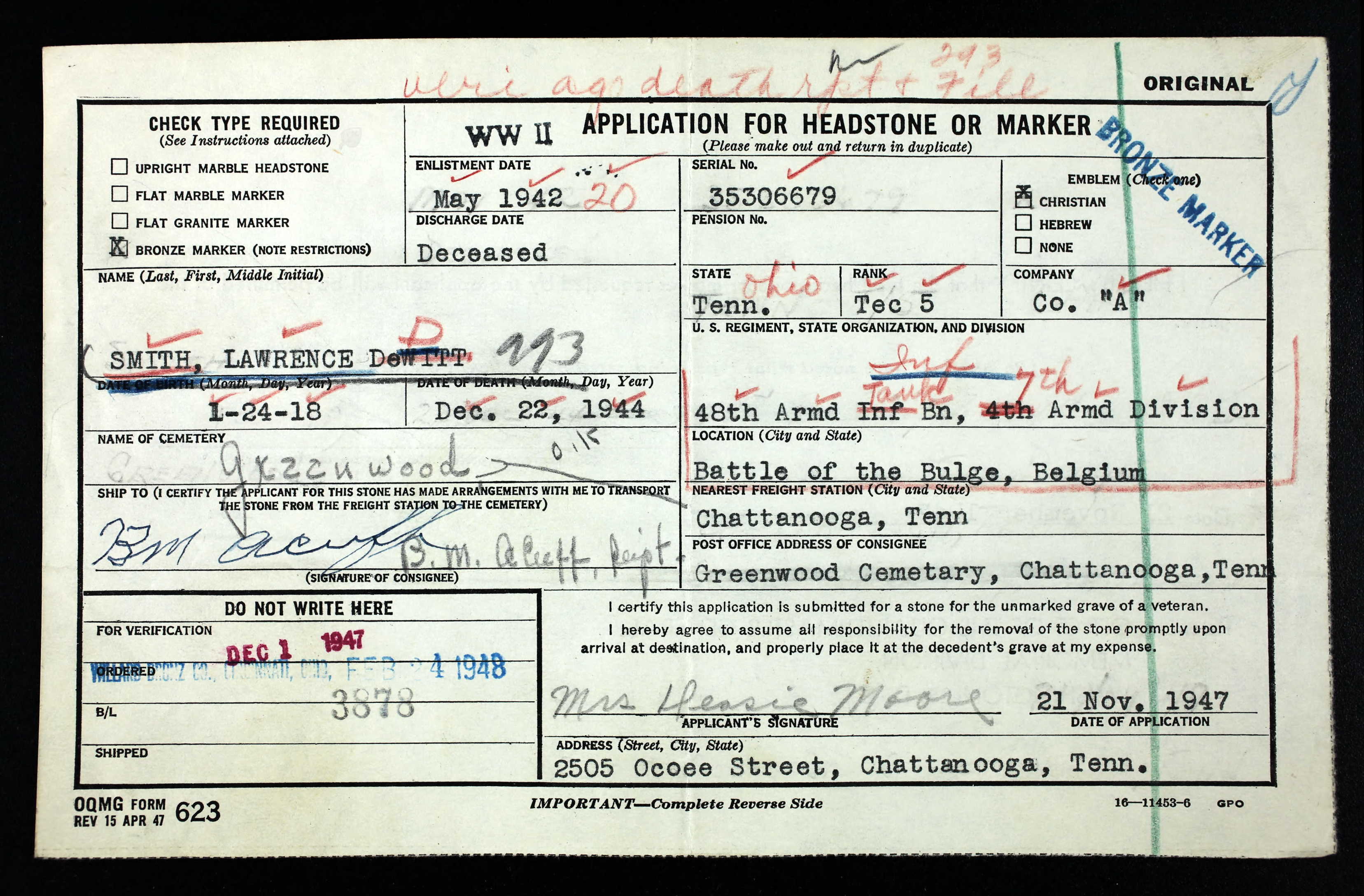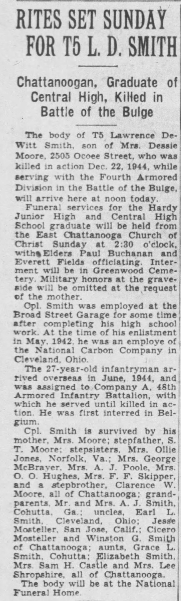 The body of T5 Lawrence DeWitt Smith, son of Mrs. Dessie Moore, 2505 Ocoee Street, who was killed in action Dec. 22, 1944, while serving with the Fourth Armored Division in the Battle of the Bulge, will arrive here at noon today. Funeral services for the Hardy Junior High and Central High School graduate will be held from the East Chattanooga Church of Christ. Interment will be in Greenwood Cemetery with military honors at the graveside.