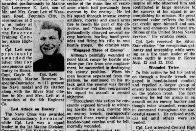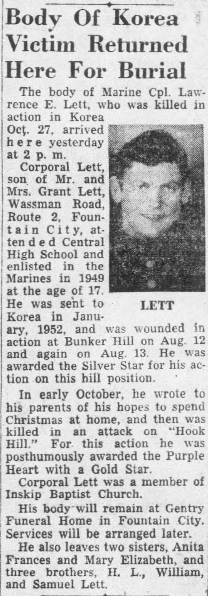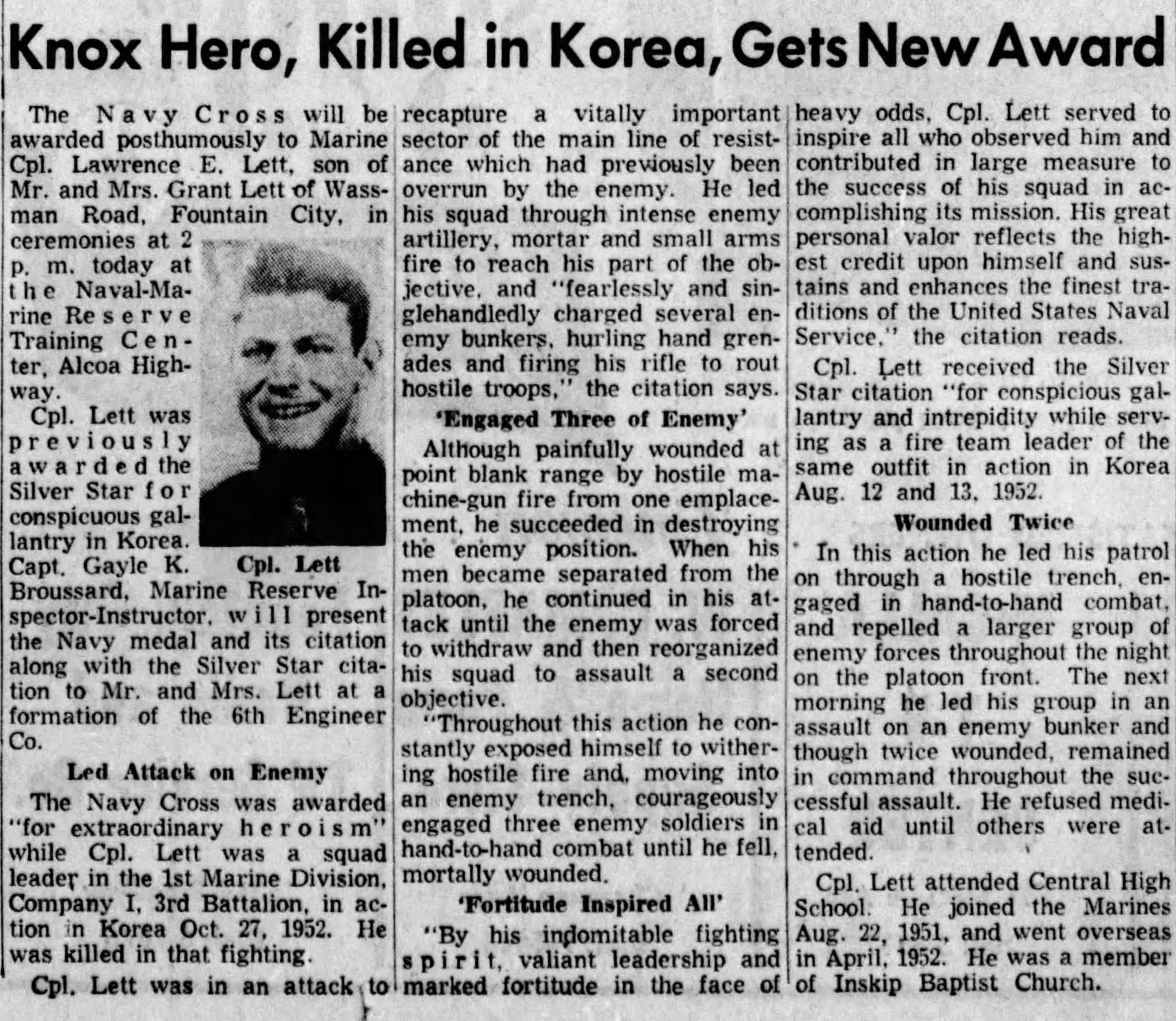 Lawrence Everette Lett Citation. The Navy Cross is presented to Lawrence Everette Lett, Corporal, U.S. Marine Corps, for extraordinary heroism while serving as a Squad Leader of Company I, Third Battalion, First Marines, First Marine Division Reinforced, in action against enemy aggressor forces in Korea on 27 October 1952. Participating in an attack to recapture a vitally important sector of the main line of resistance which was previously overrun by the enemy, Corporal Lett fearlessly led his squad through intense enemy artillery, mortar and small-arms fire to reach his portion of the objective and single-handedly charged several enemy bunkers, hurling hand grenades and firing his rifle to rout the hostile troops. Although painfully wounded at point-blank range by hostile machine-gun fire from one emplacement, he succeeded in completely destroying the enemy position. When his men became separated from the platoon, he gallantly continued in the attack until the enemy was forced to withdraw and then reorganized his squad to assault a second objective. Throughout this action, he constantly exposed himself to withering hostile fire and, moving into an enemy trench, courageously engaged three enemy soldiers in hand-to-hand combat until he fell, mortally wounded. By his indomitable fighting spirit, valiant leadership and marked fortitude in the face of heavy odds, Corporal Lett served to inspire all who observed him and contributed in large measure to the success of his squad in accomplishing its mission. His great personal valor reflects the highest credit upon himself and sustains and enhances the finest traditions of the United States Naval Service. He gallantly gave his life for his country. Authority Board Serial 1084 December 14, 1953.