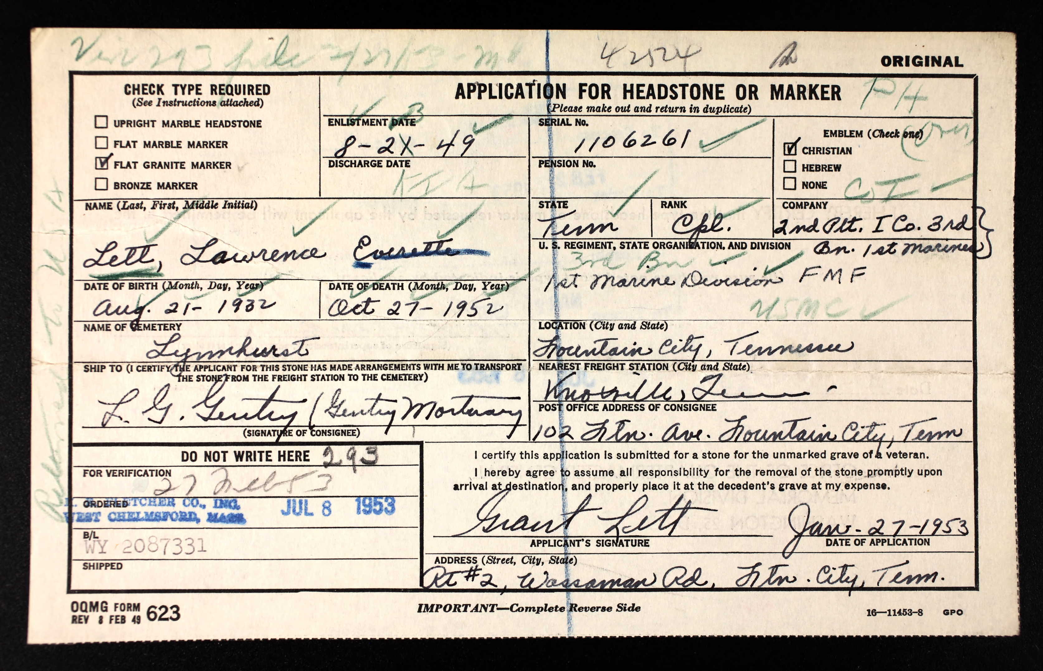Born in 1932 in the Fountain City community of Knoxville, Lett dropped out of Central High School and went on to enlist in the Marines when he was 17. According to his Navy Cross citation, Lett was a squad leader in Company I, Third Battalion, First Marines, First Marine Division Reinforced. Lett died while recapturing an important area in the main line of resistance in Korea.
