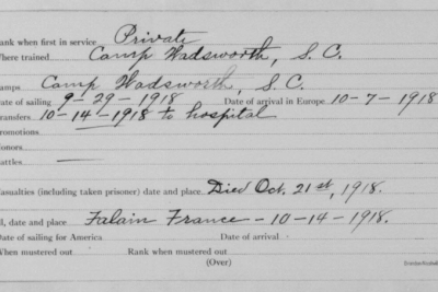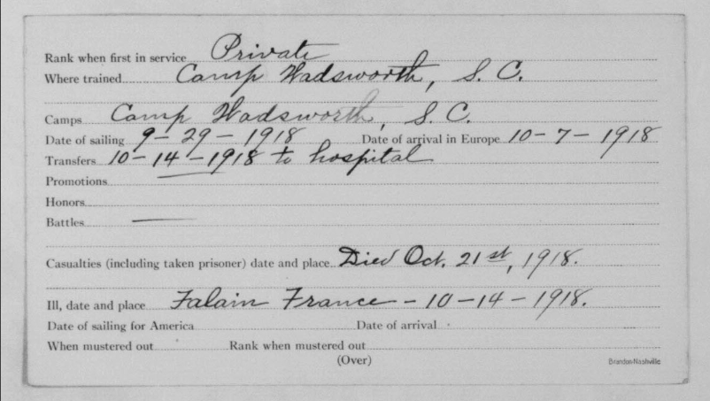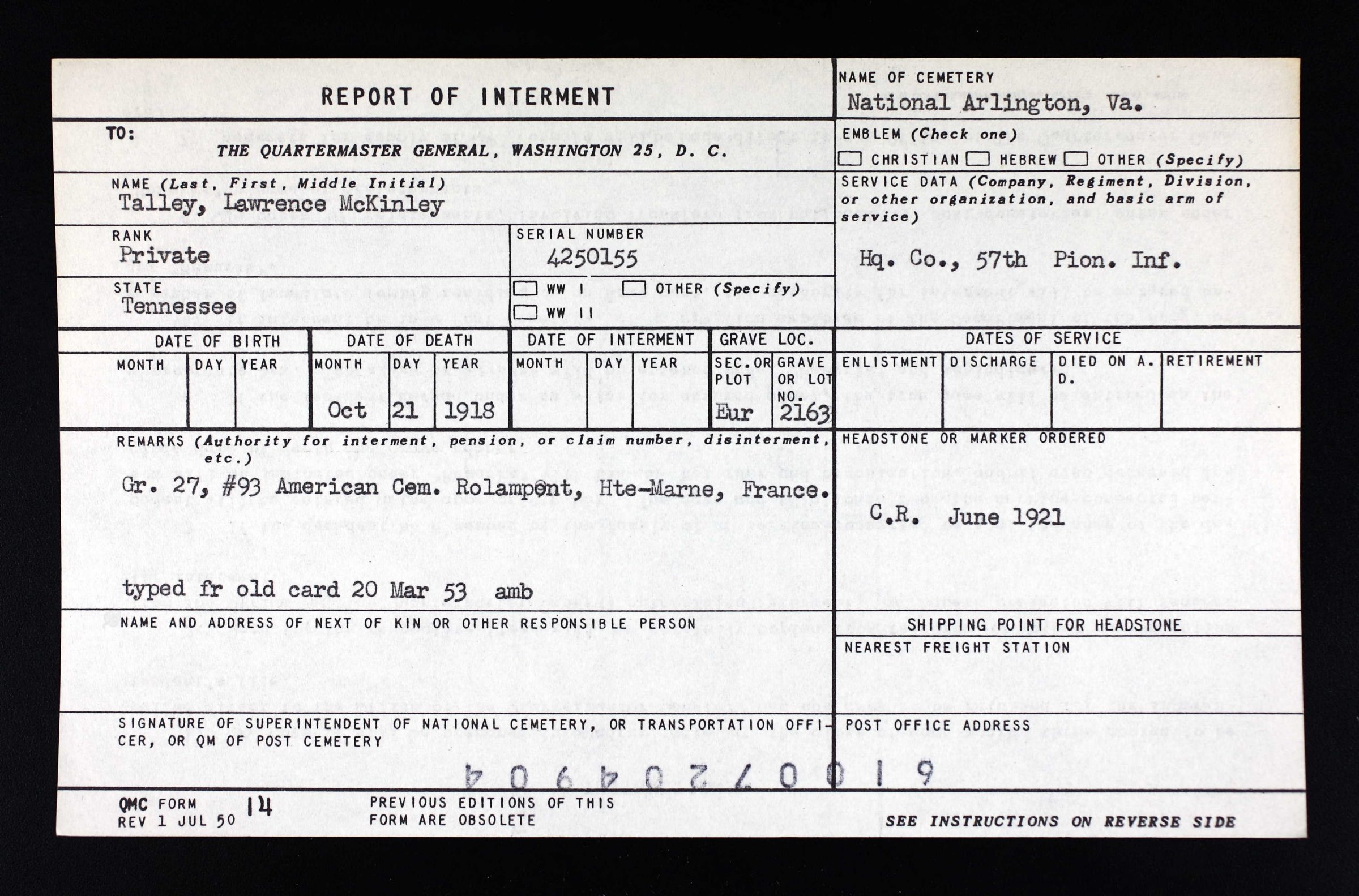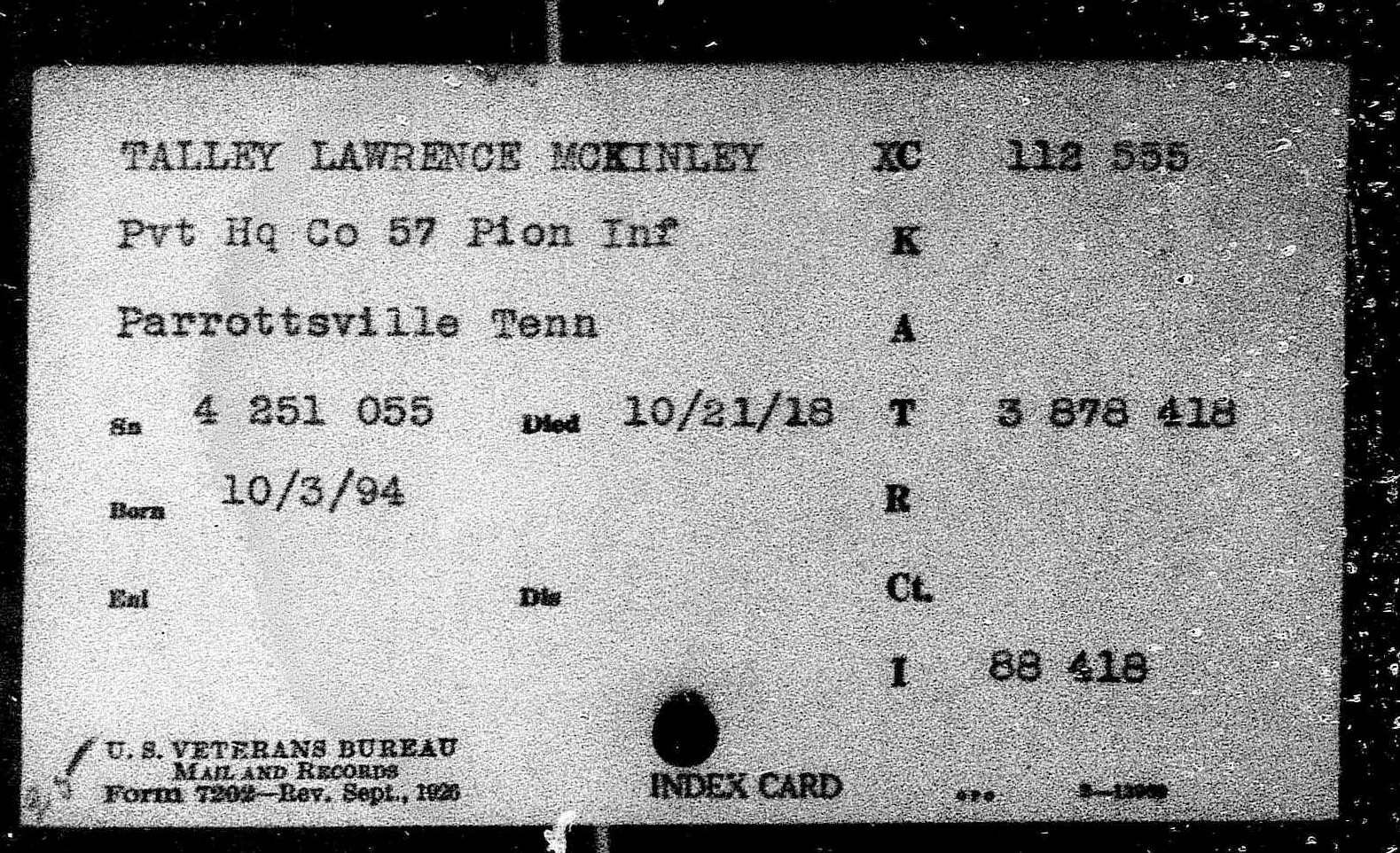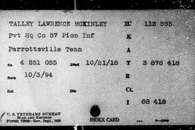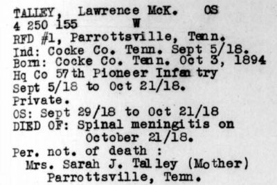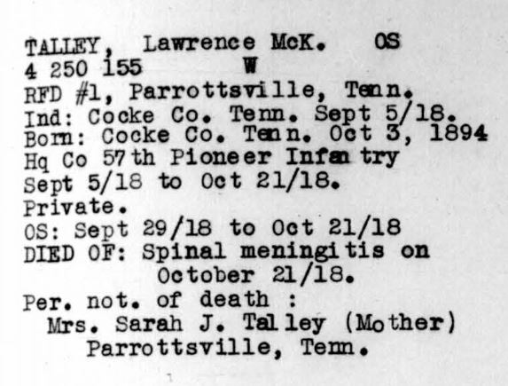 Lawrence McKinley Talley was born 3 October 1894, Parrottsville, Cocke County, Tennessee. He died of spinal meningitis on 21 October 1918 Falain in France. Pvt Talley was initially buried at the American Cemetery Rolampont, Marne, France. Reburied at Arlington National Cemetery, Arlington, VA, Eur, 2163