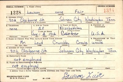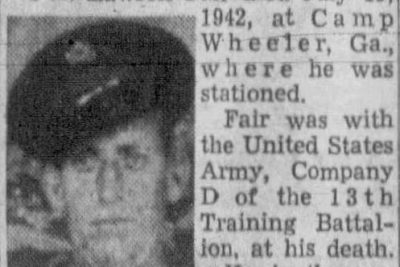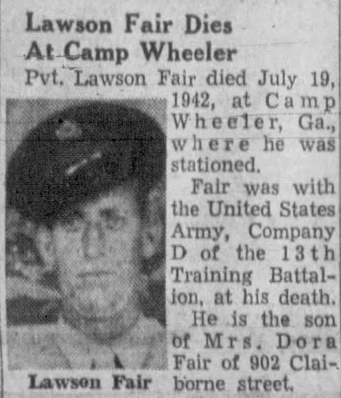 Pvt. Lawson Fair, died July 19, 1942, at Camp Wheeler, Ga., where he was stationed. Fair was with the United States Army, Company D of the 13th Training Battalion, at his death. He is the son of Mrs. Dora Fair of 902 Claiborne street.