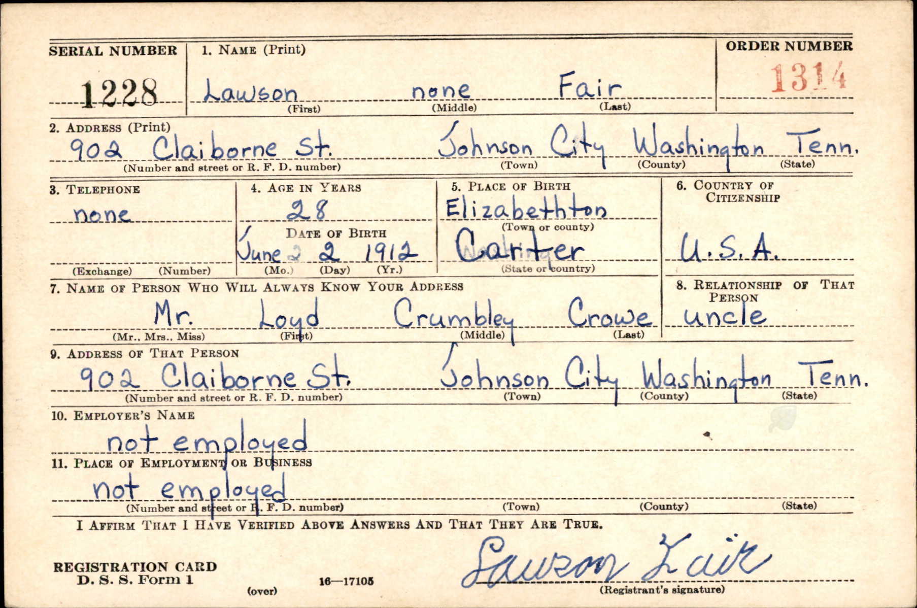 Pvt Fair was the son of Charles Fair and Dora Bell Crowe. He was married to Nina Morrison Fair who died of rheumatic heart disease at Tacoma Hospital at Greenville on 23 February 1942. Lawson Fair enlisted on 2 June 1942 at Fort Oglethorpe, Georgia. He died of a sunstroke in Macon, Bibb County, Georgia at the age of 30.