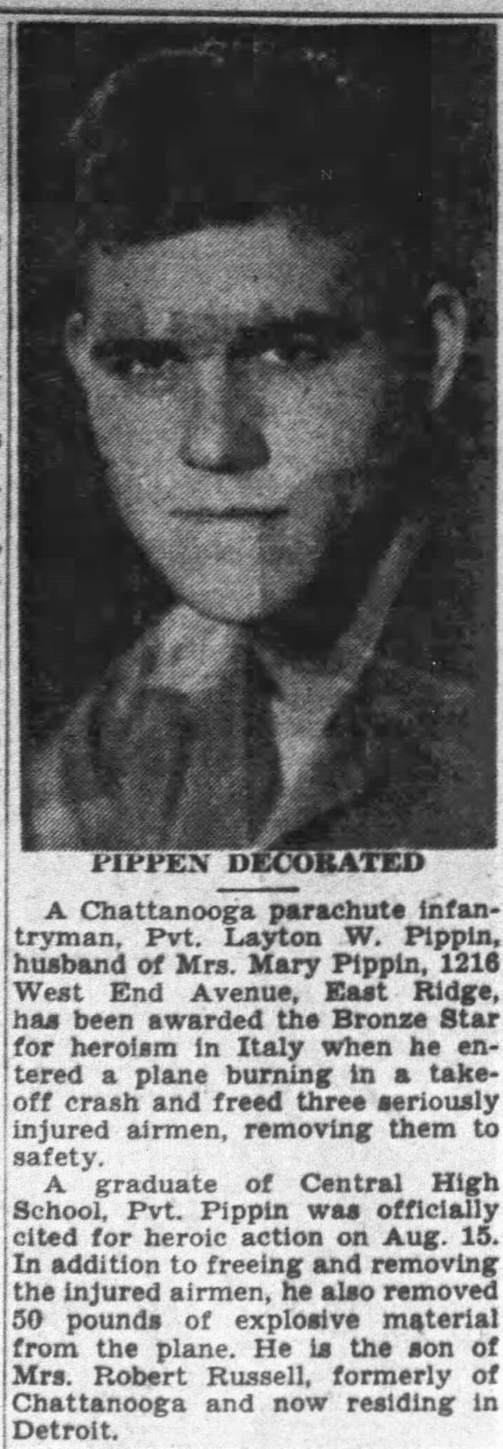 Pvt. Layton W. Pippin had been awarded the Bronze Star for heroism in Italy when he entered a plane buring in a take-off crash and freed three seriously injured airmen, removing them to safety. He also removed 50 pounds of explosive material from the plane.
