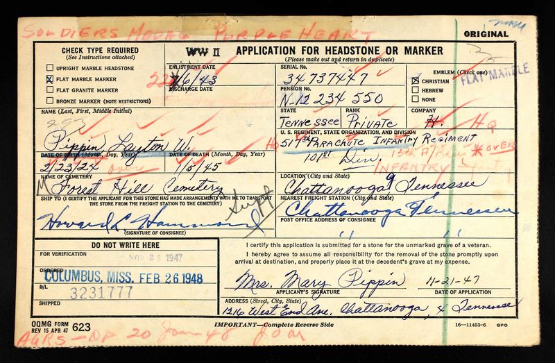 Layton Pippin was buried at Henri-Chapelle Cemetery, Belgium. In Oct, 1947 his body was exhumed and reinterred at Forest Hills Cemetery, Chattanooga, TN with full Military Honors.