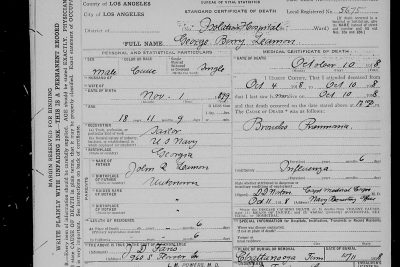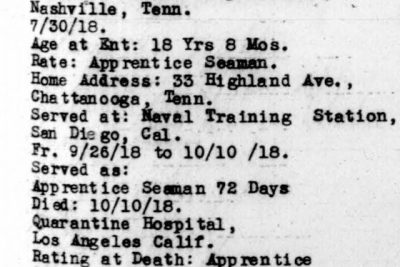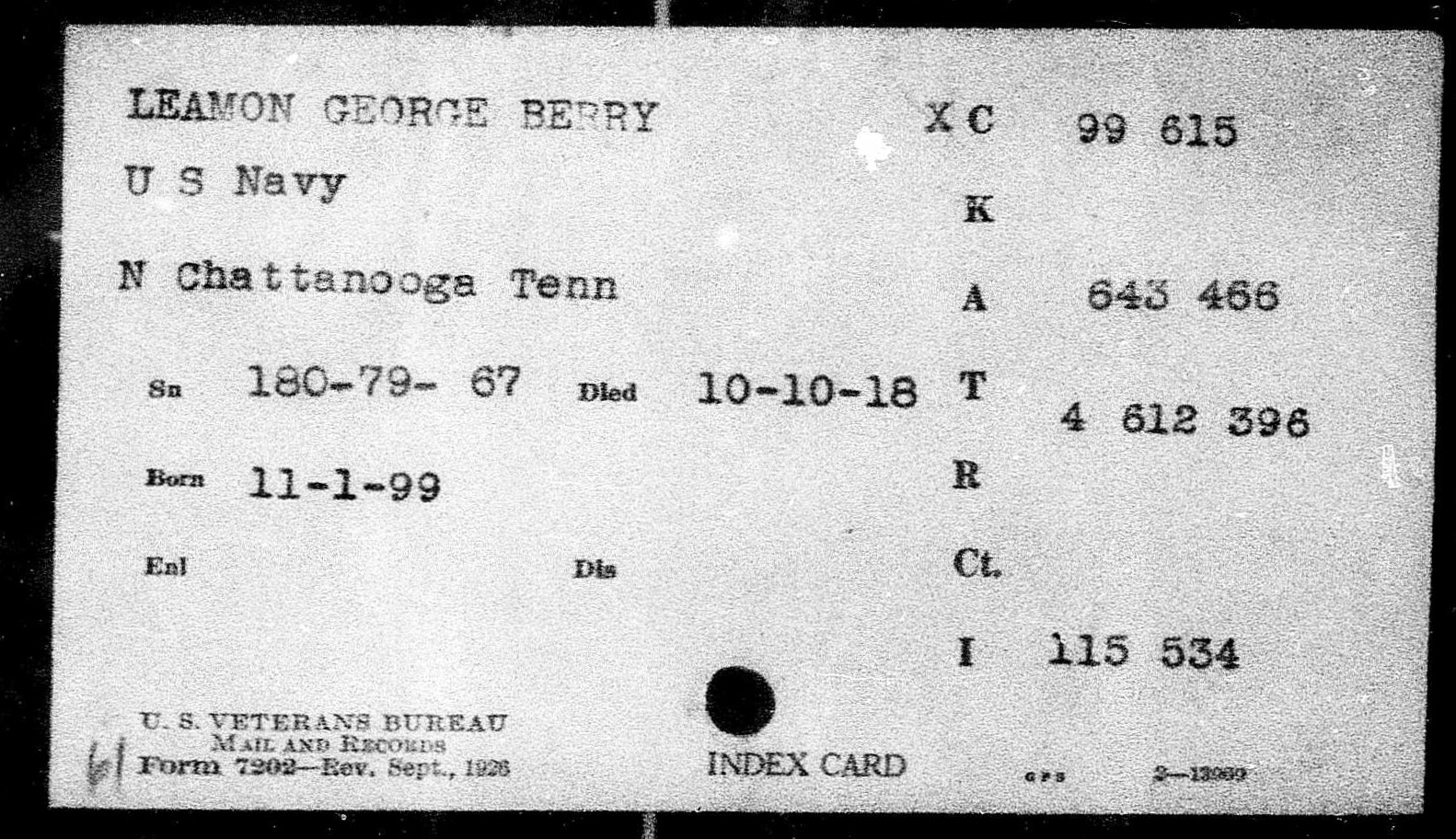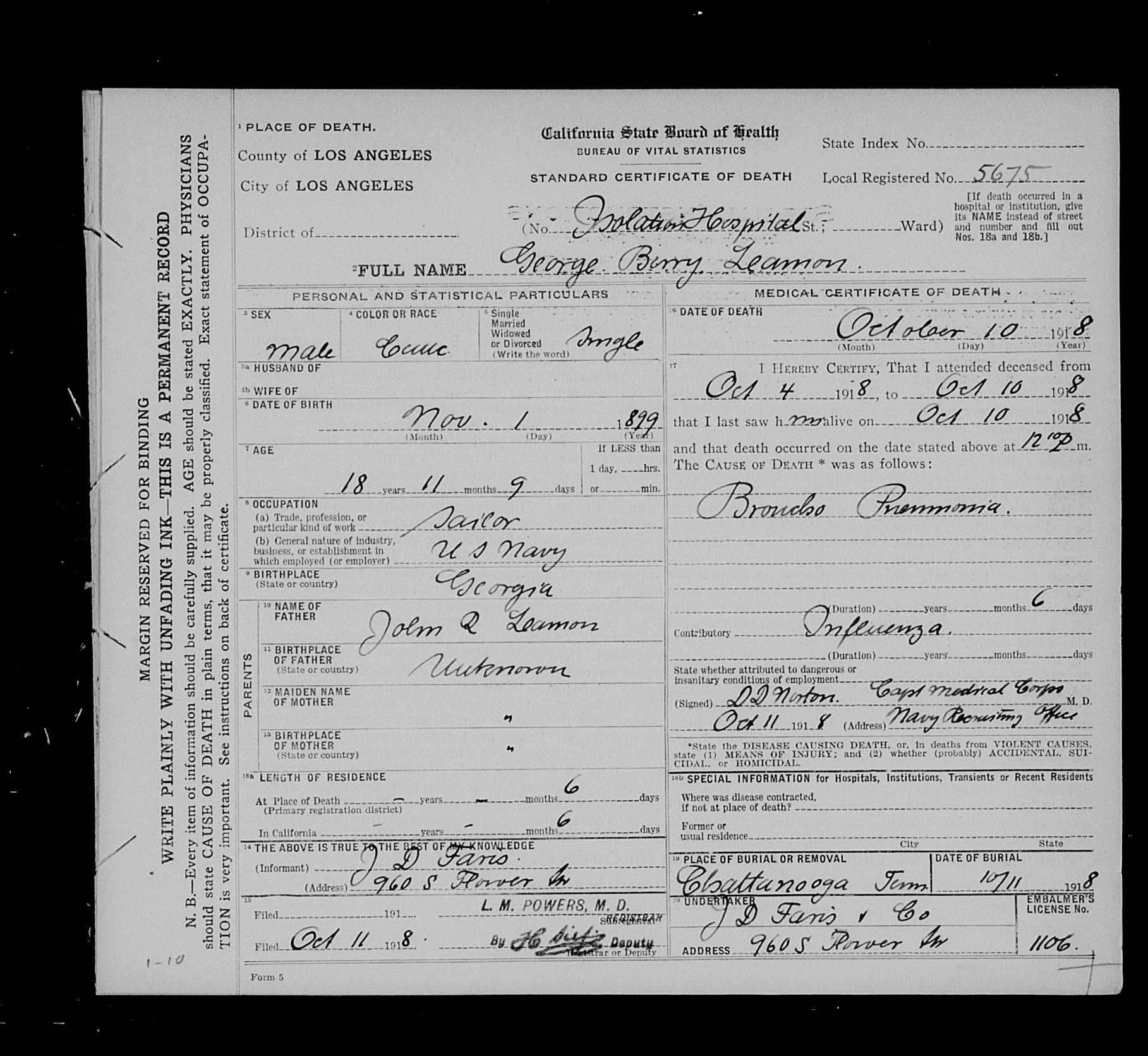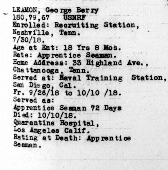 George Berry Leamon, Apprentice Seaman, US Navy. He died at the quarantine hospital in Los Angeles, California of broncho pneumonia and influenza. Hometown: Chattanooga, Hamilton County, TN. Son of John Timothy Leamon and Caroline Matilda Berry.