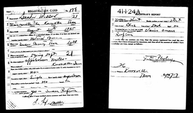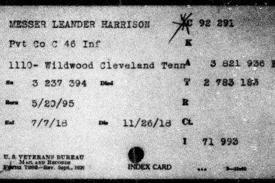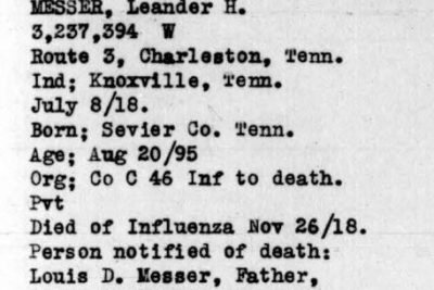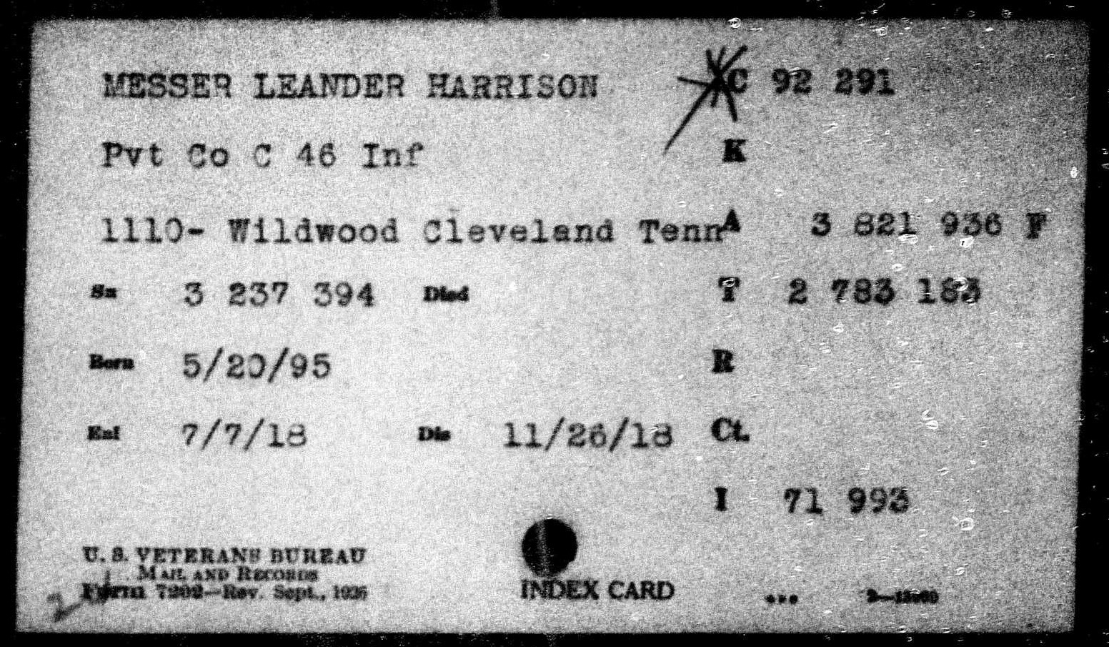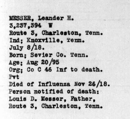 Leander Harrison Messer was born 20 August 1895, Sevier County, Tennessee, son of Louis Messer and Louthenia Whaley. Pvt Messer was a farmer before he was inducted into military service on 5 July 1918 at Fort Thomas, Kentucky. He died of influenza on 26 November 1918, Camp Sheridan, Montgomery, Alabama.