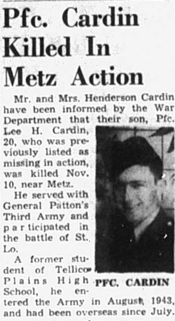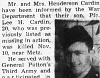 Mr. and Mrs. Henderson Cardin have been informed by the War Department that their son, Pfc. Lee H. Cardin, 20, who was previously listed as missing in action, was killed Nov. 10, near Metz.
