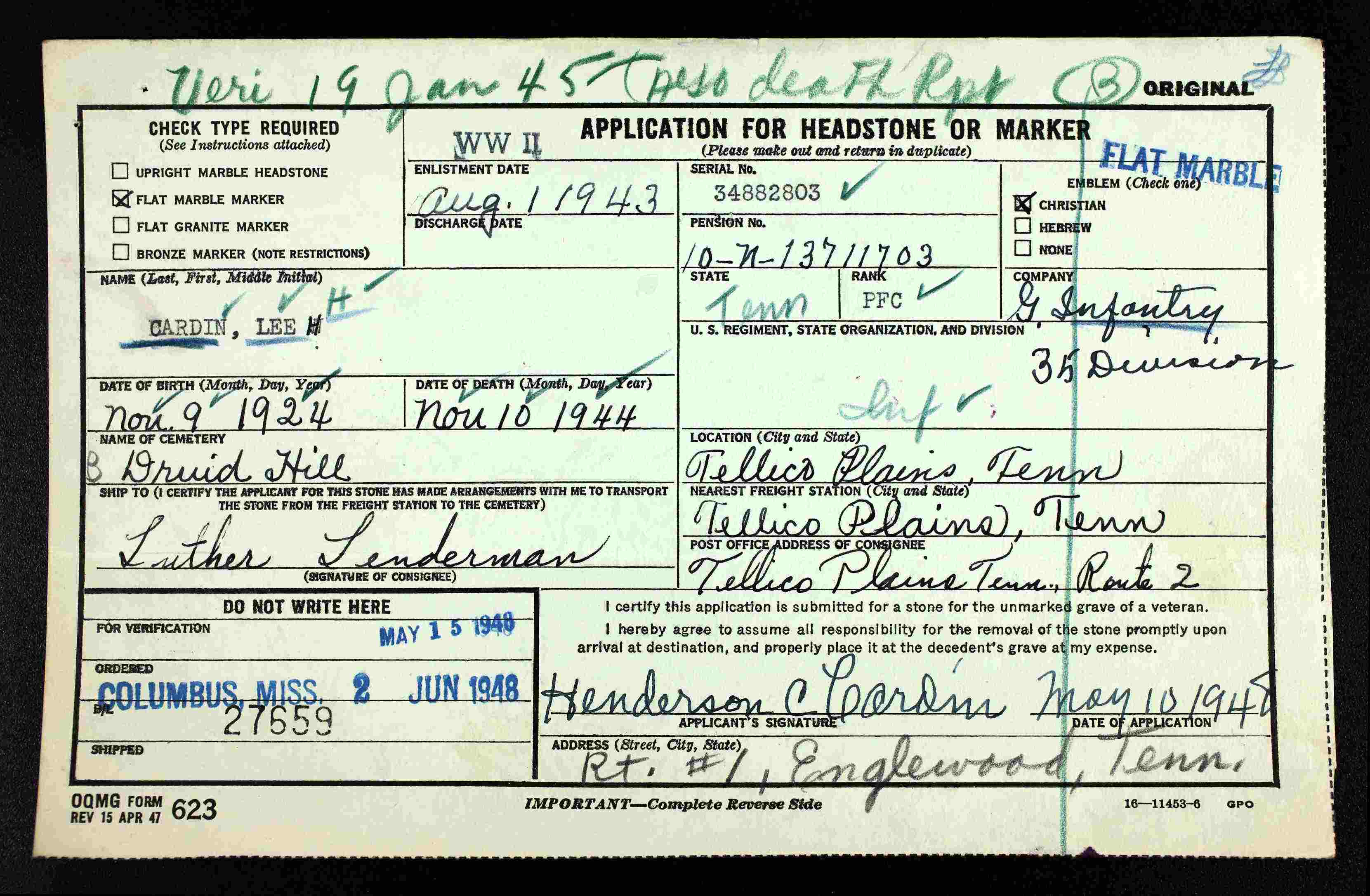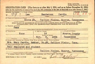 Pfc. Lee Henderson Cardin, son of Mr. and Mrs. Henderson Cardin of Tellico Plains R. 2, is reported as missing in action. Lee was serving with the 35th Division, a unit of Gen. Patton’s Third Army. He was in the Battle of Metz. He recently celebrated his twentieth birthday. Lee was a student at Tellico Plains High School at the time of his induction. He landed in England on July 1 and was in action in France July 14.