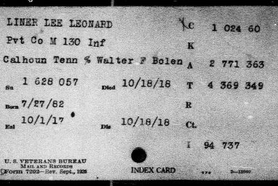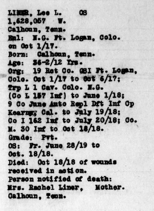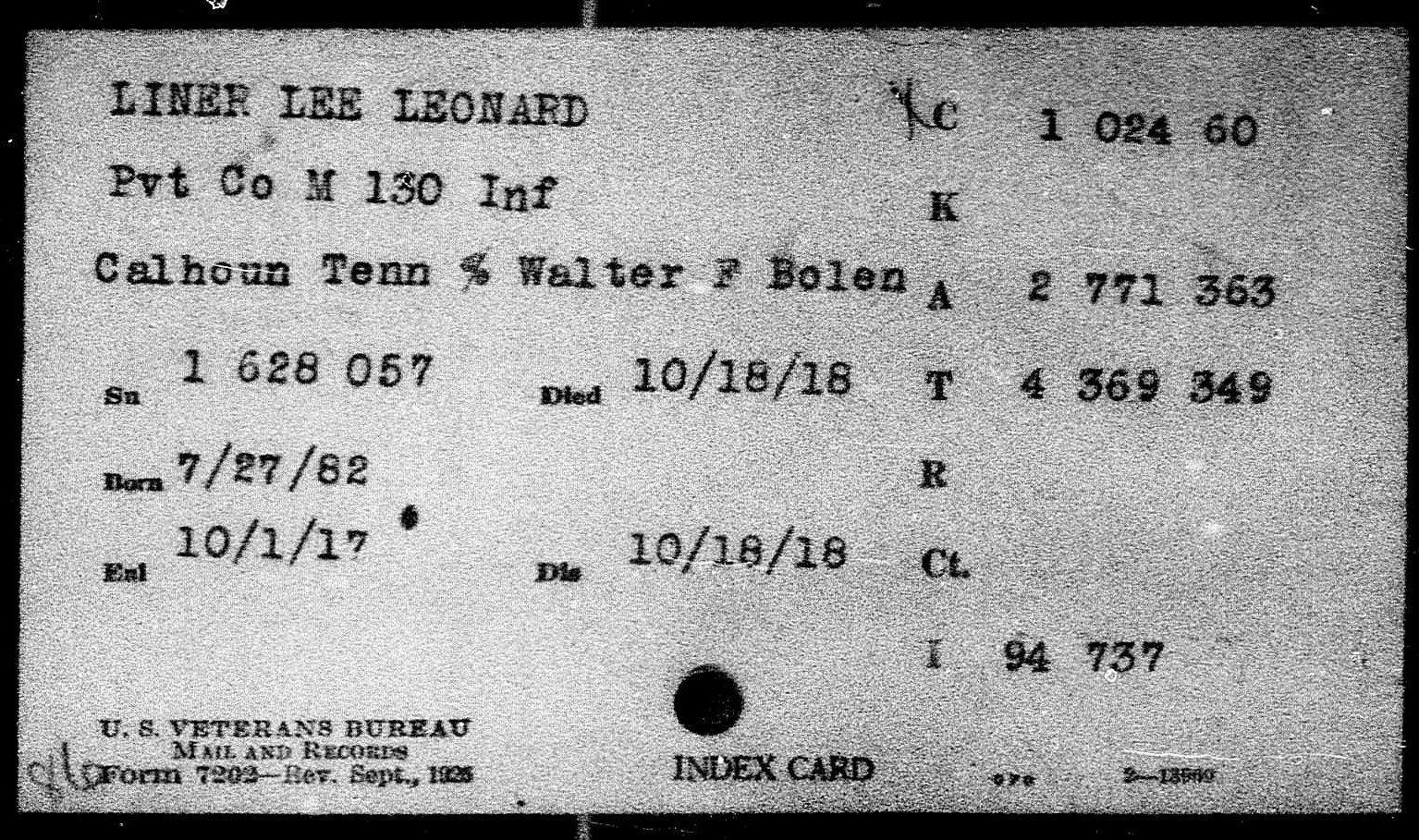 Leonard (Lenard) Lee Liner was born 27 July 1882, son of James Benjamin Liner and Rachel Jane Hemphill. Husband of Manerva Elizabeth Swafford. He died of wounds received in action 18 October 1917 in France.