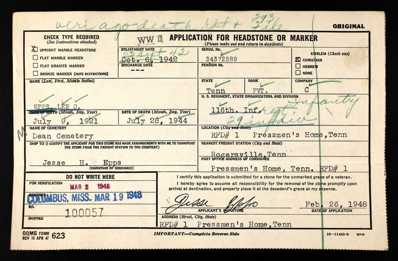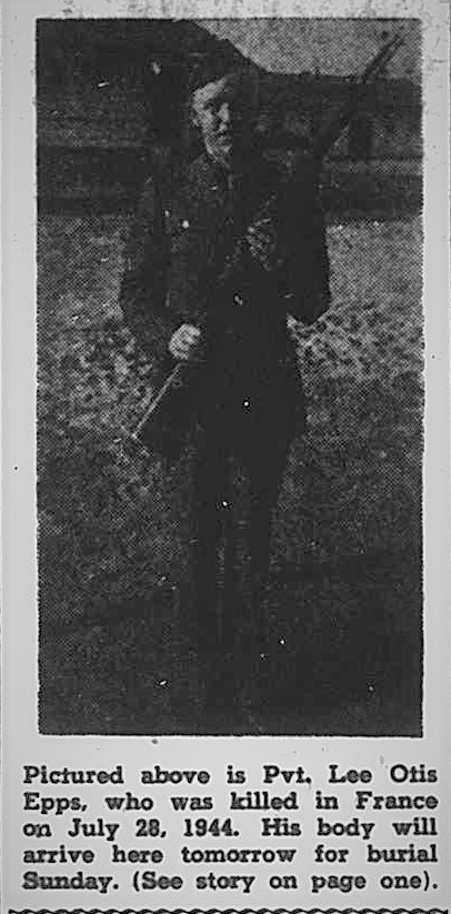 Pvt Lee Otis Epps was killed July 28, 1944 somwhere in France. He entered service October 6, 1942, going overseas in June of this year. He was the son of Mr. Jess Epps of Pressmen’s home.
