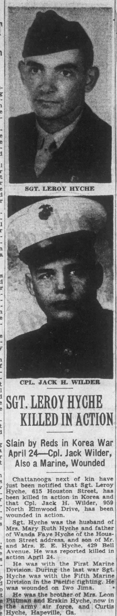 Sgt. Hyche was the husband of Mrs. Mary Ruth Hyche and father of Wanda Faye Hyche of the Houston Street address, and son of Mr. and Mrs. E.E. Hyche, 429 Bell Avenue. He was reported killed in action April 24. He was with the First Marine Division. During the last war Sgt. Hyche was with the Fifth Marine Division in the Pacific fighting. He was wounded on Iwo Jima. He was the brother of Mrs. Leon Pittman and Erskin Hyche, now in the army air force, and Curtis Hyche, Hapeville, Ga.