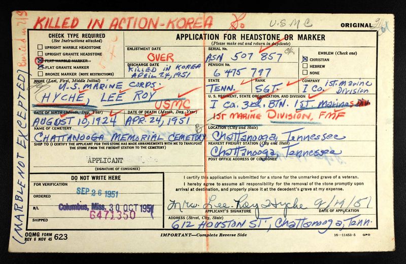 Sergeant Hyche was a member of Company I, 3rd Battalion, 1st Marines, 1st Marine Division. He was Killed in Action while fighting the enemy in Korea.