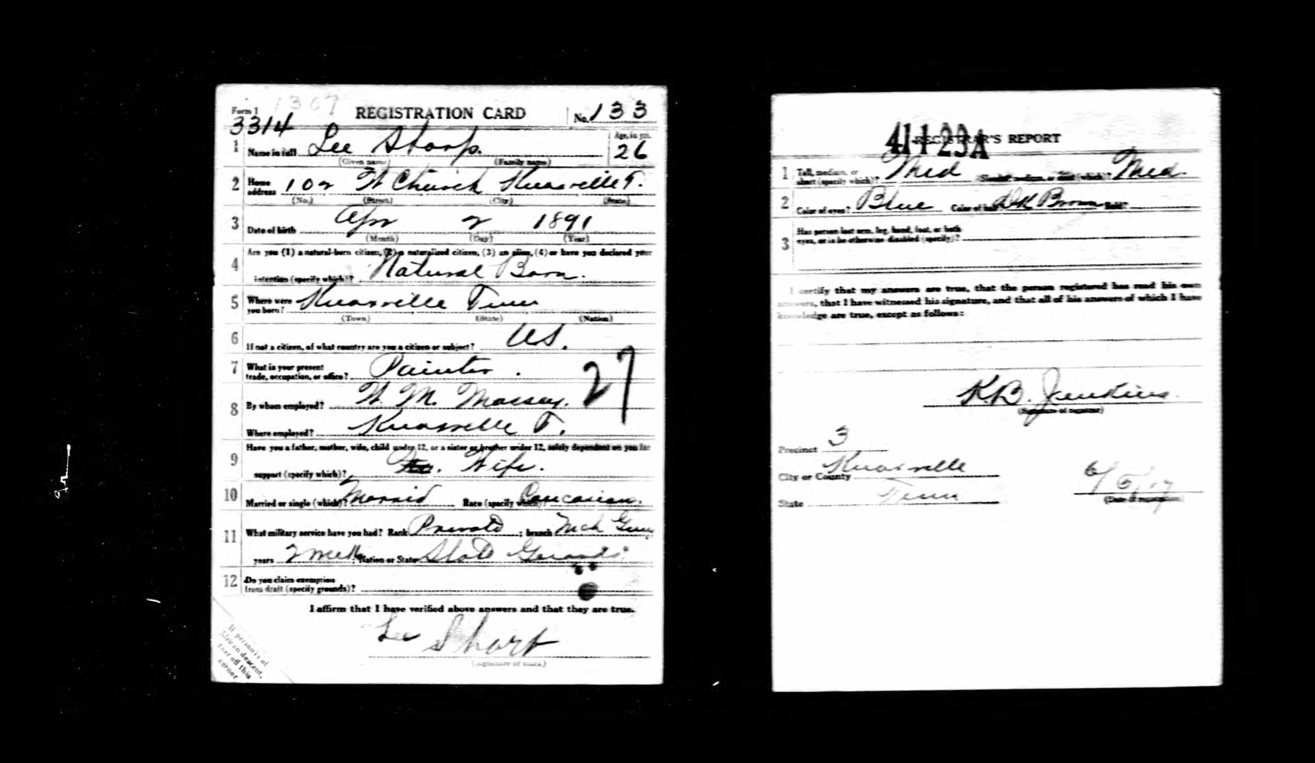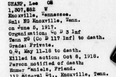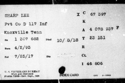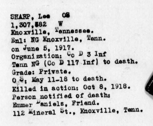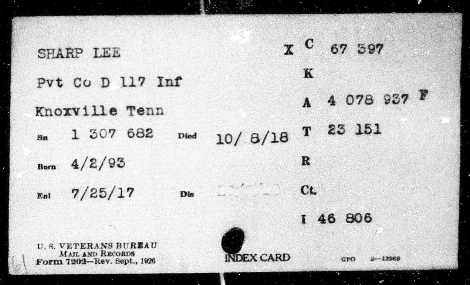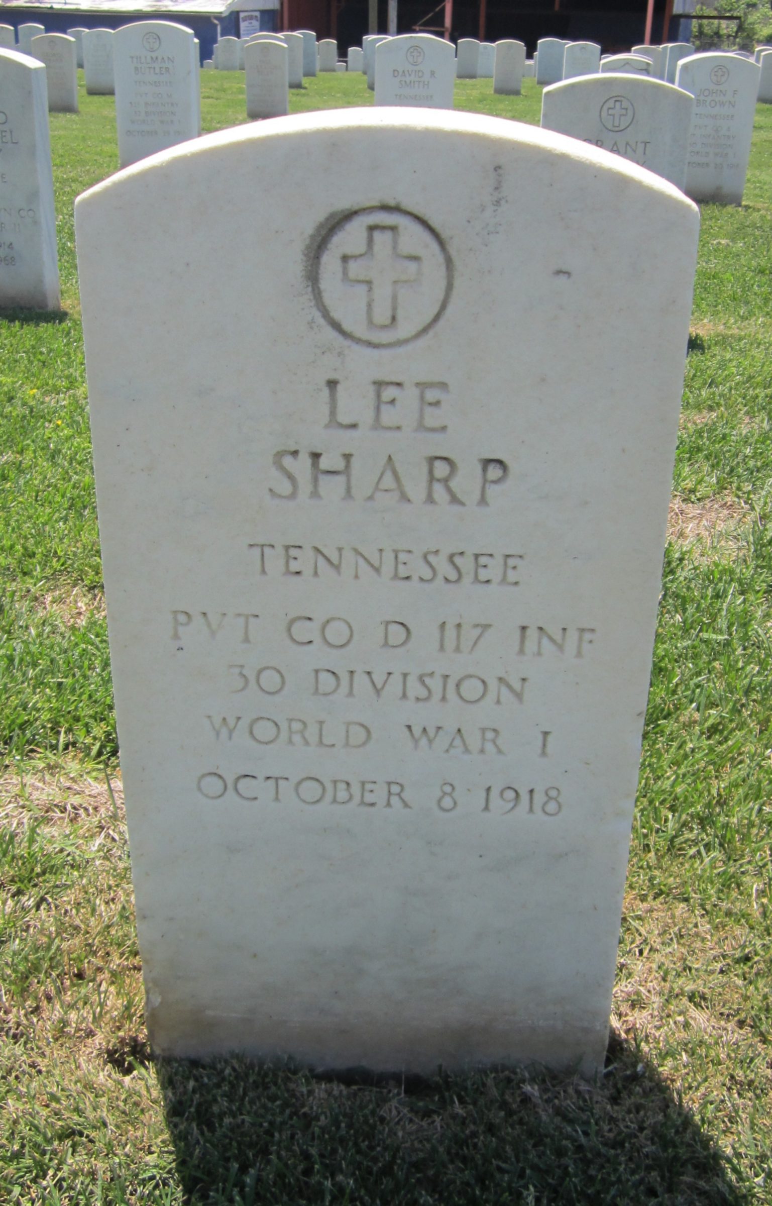 Lee Sharp enlisted in Company D, 117th Infantry, 30th Division, on June 30, 1917. After training at Camp Sevier, S.C., he went to France in May 1918 with his organization. He took part in all engagements of his command until October 8, 1918 on which date he was killed. He held the rank of Private.