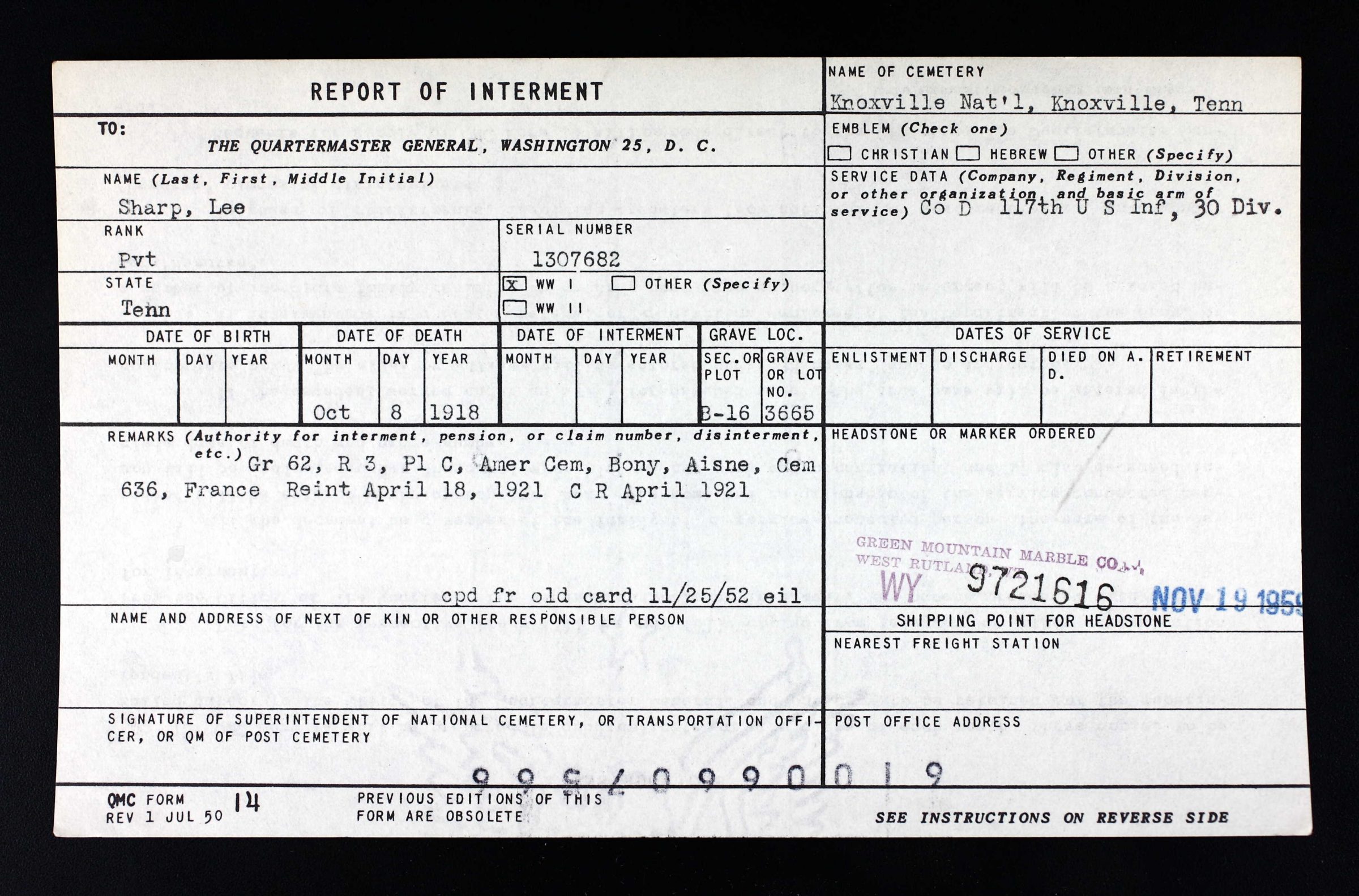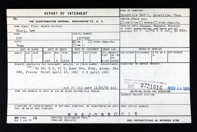 Pvt Sharp was initially buried at the American Cemetery, Bony, Aisne, France. He is buried at the Knoxville National Cemetery, B-16, 3665.