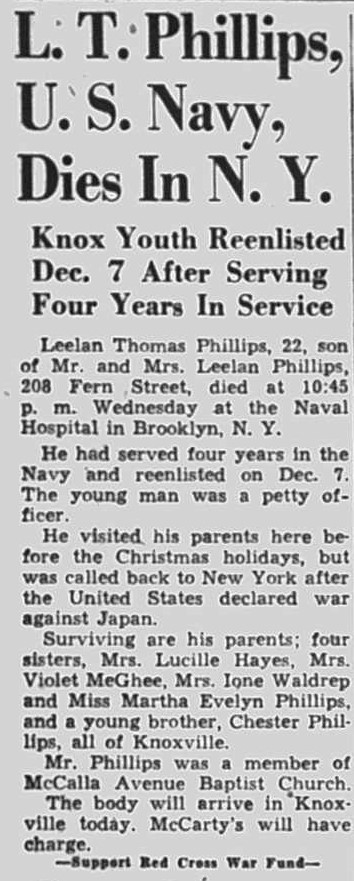 Leelan Thomas Phillips, 22, son of Mr. and Mrs. Leelan Phillips, 208 Fern Street, died at 10:45 p.m. Wednesday at the Naval Hospital in Brooklyn, N.Y. He had served four years in the Navy and reenlisted on Dec. 7. The young man was a petty officer. He visted his parents here before the Christmas holidays but was called back to New York after the United States declared war against Japan.