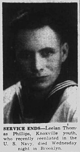 Leelon Thomas Phillips enlisted in the U.S. Navy on December 7, 1937, serving 39 months in China and the Philippines. He re-enlisted December 7, 1941. He died in Brooklyn Navy Hospital January 7, 1942, at the age of 22. He was a member of McCalla Venue Baptist Church and graduated from Knoxville High School. Son of Mr. and Mrs. L. Phillips, 208 Fern St., Knoxville.