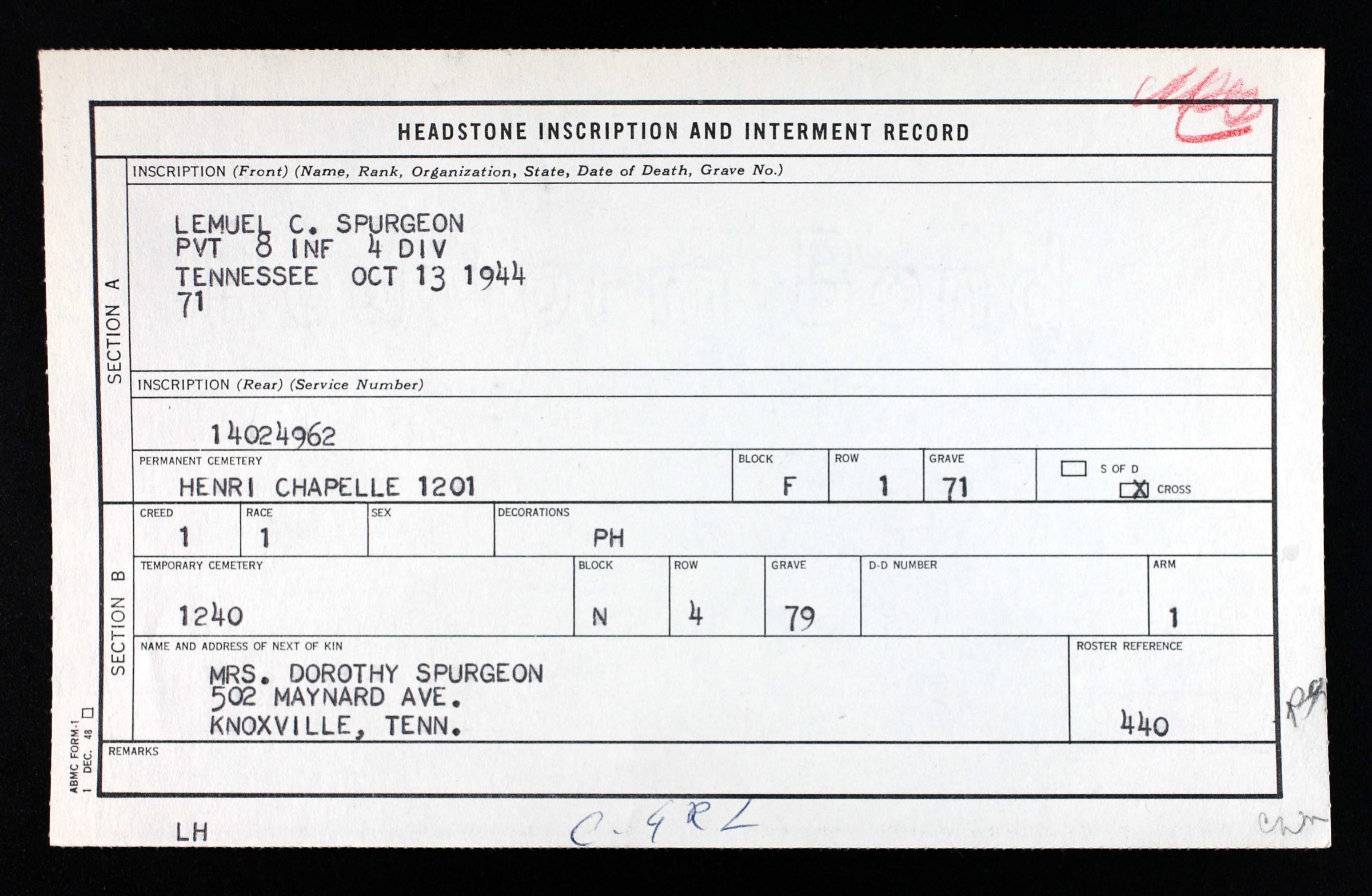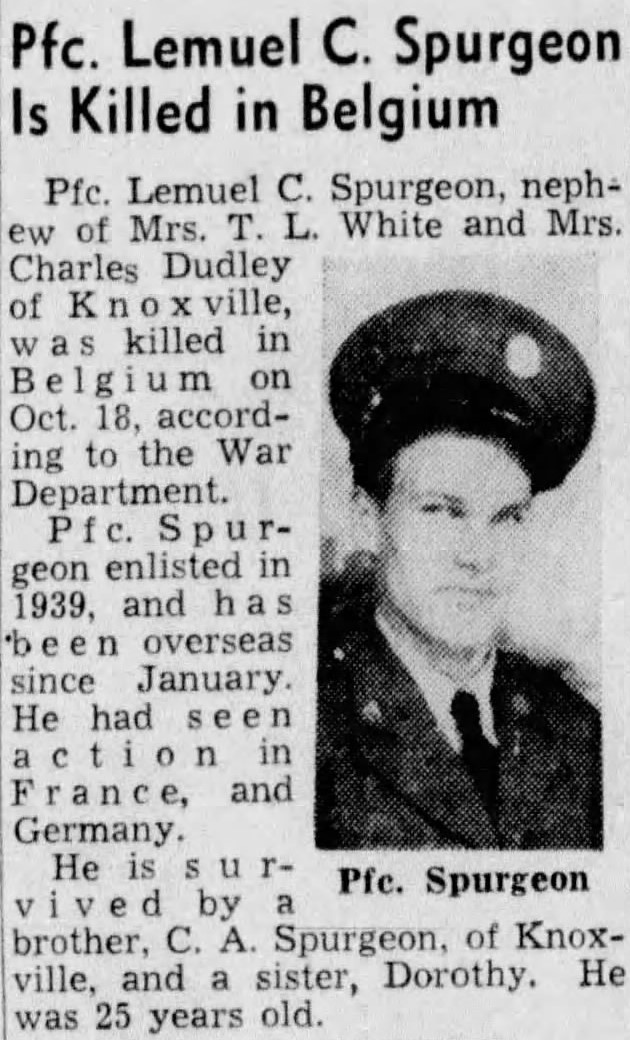 Pfc. Lemuel C. Spurgeon, nephew of Mrs. T.L. White and Mrs. Charles Dudley of Knoxville, was killed in Belgium in Oct. 18, according to the War Department. Pfc. Spurgeon enlisted in 1939, and has been overseas since January. He had seen action in France, and Germany. He is survived by a brother, C.A. Spurgeon, of Knoxville, and a sister, Dorothy. He was 25 years old.