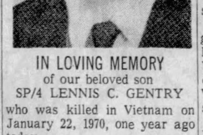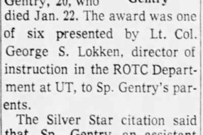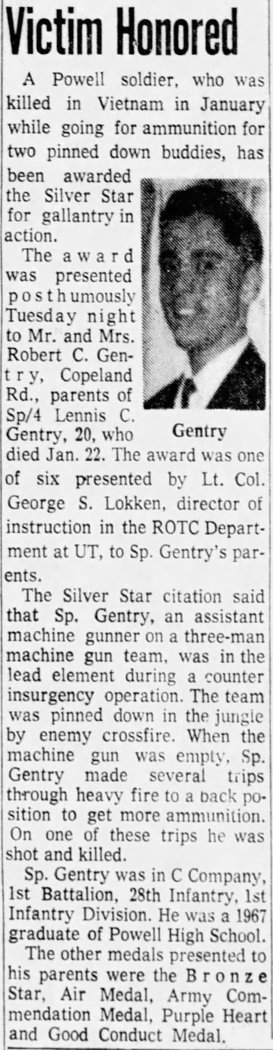 A Powell soldier, who was killed in Vietnam in January while going for ammunition for two pinned down buddies, has been awarded the Silver Star for gallantry in action. The award was presented posthumously to Mr. and Mrs. Robert C. Gentry, Copeland Rd., parents of Sp/4 Lennis C. Gentry, 20, who died Jan. 22. The award was one of six presented by Lt. Col George S. Lokken, director of instruction in the ROTC Department at UT, to Sp. Gentry’s parents. The Silver Star citation said that Sp. Gentry, an assistant machine gunner on a three-man machine gun team, was in the lead element during a counter insurgency operation. The team was pinned down in the jungle by enemy crossfire. When the machine gun was empty, Sp. Gentry made several trips through heavy fire to a back position to get more ammunition. On one of these trips he was shot and killed. Sp. Gentry was in C Company, 1st Battalion, 28th Infantry, 1st Infantry Division. He was a 1967 graduate of Powell High School. The other medals presented to his parents were the Bronze Star, Air Medal, Army Commendation medal, Purple Heart and Good Conduct Medal.