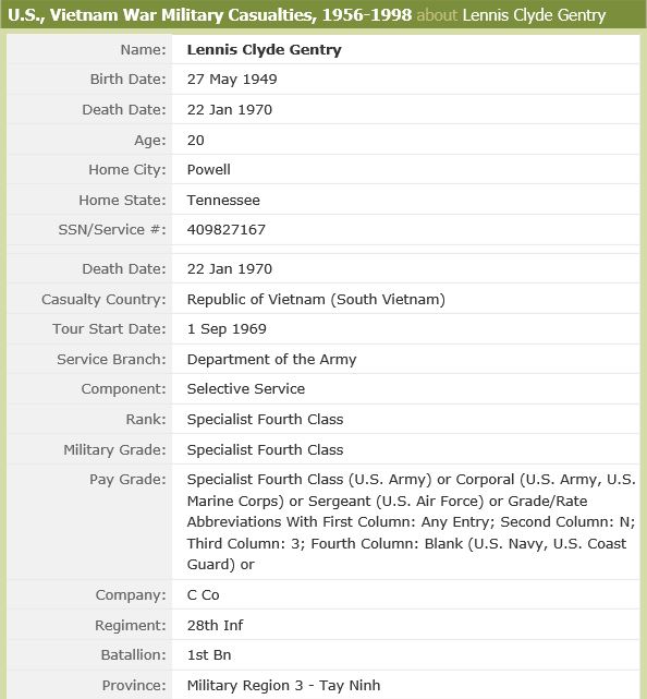 Lennis “Clyde” Gentry was Killed in Action in Tay Ninh. He was in Co C, 1st Bn, 28th BN, 1st Infantry Division., out of Fort Riley, Kansas.