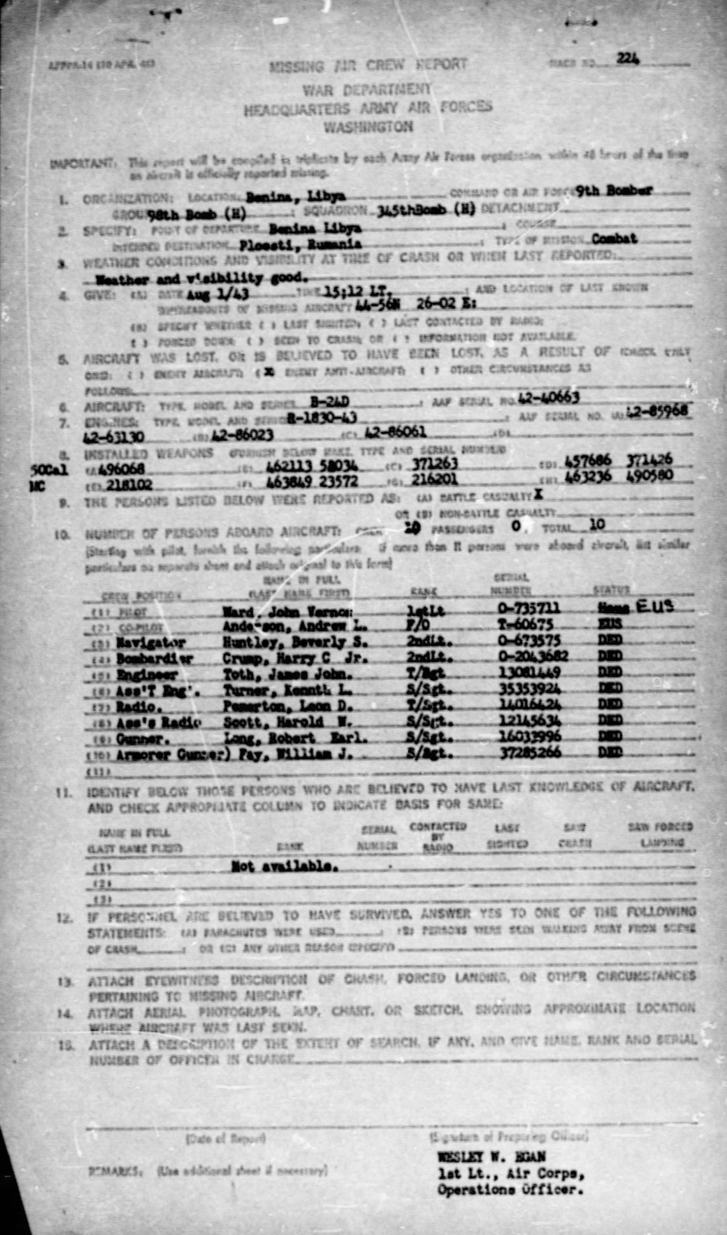 T/Sgt. Pemberton initially wasn’t assigned to the mission on the morning of August 1, 1943, but fate interceded and he was assigned at the last minute to the aircrew of the Maternity Ward, due to three of the crew members being ill. T/SGT Pemberton was one of three last minute assignments to the aircrew. The aircrew of the Maternity Ward on that fateful morning consisted of: Lt. John V. Ward, pilot; Lt. Andrew L. Anderson, co-pilot; Lt. Henry C. Crump, Jr., bombardier; Lt. Beverly S. Huntley, navigator; T/SGT Leon David Pemberton, radio operator; Staff Sgt. Kenneth L. Turner, gunner; Staff Sgt. Harold W. Scott, gunner, Staff Sgt. William J. Fay, waist gunner, Staff Sgt. Robert E. Long, tail gunner, and Sgt. James J. Toth, top gunner.