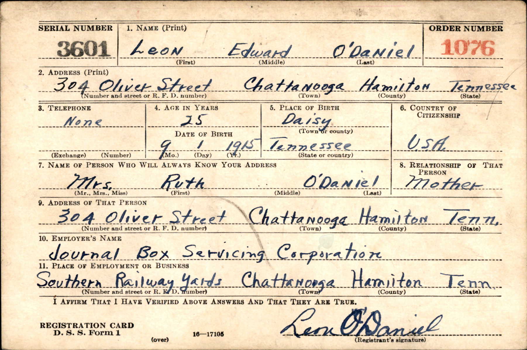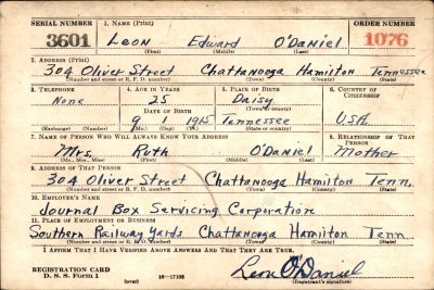 Pfc. O’Daniel, 29, was the husband of Mrs. Iva Dean Camp O’Daniel and the father of Brenda Joyce O’Daniel, 2408 Sixth Avenue Courts. He was the son of Mrs. Ruth O’Daniel, 304 Oliver Street. Pfc. O’Daniel entered the service in January/ 1944, and went overseas in September of the same year. He graduated from Central High School in the class of 1936 and was prominent in atheletics. He has one brother, Clyde O’Daniel, who resides in California.