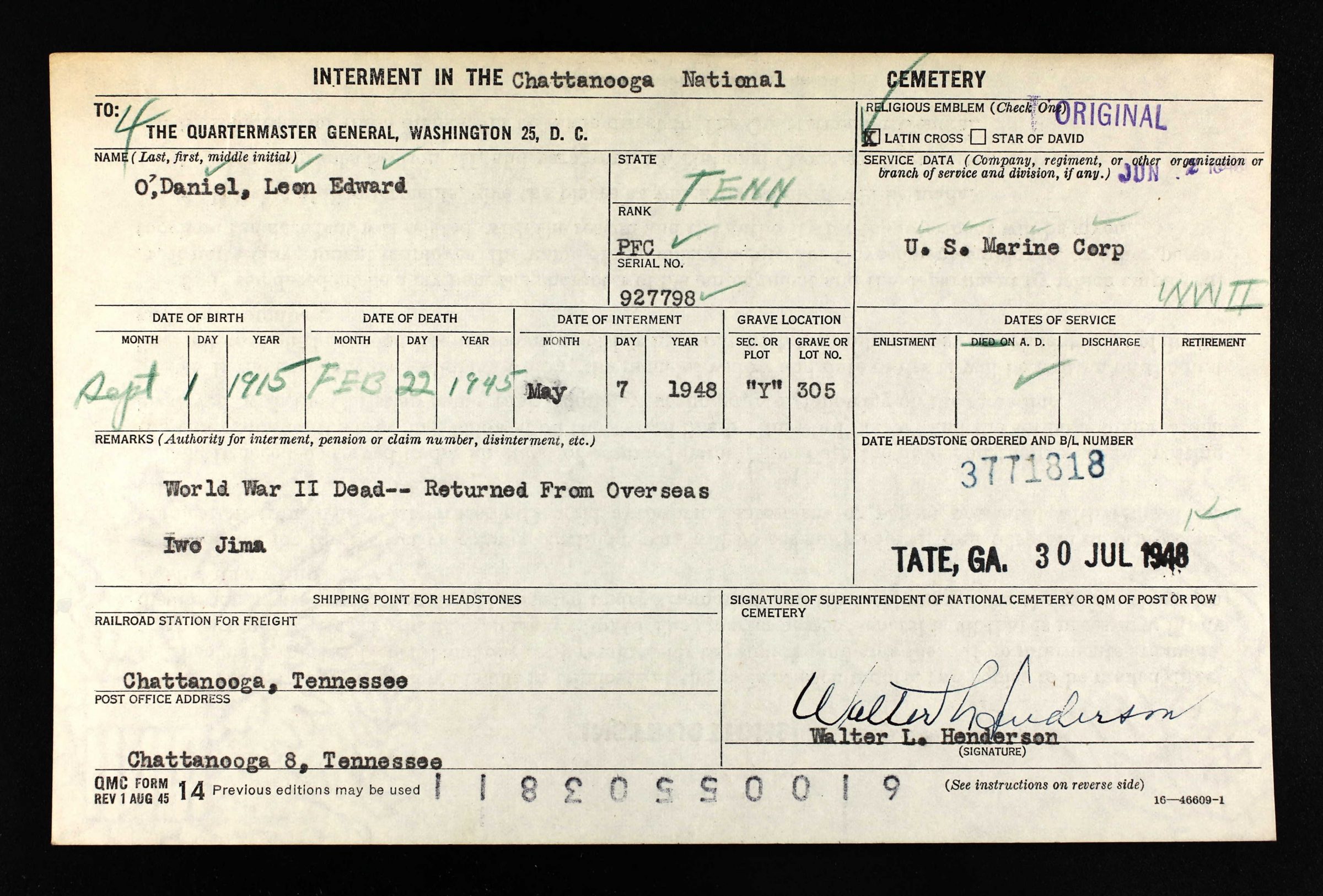 PFC Leon Edward O’Daniel served in the Joint Assault Signal Company (JASCO) of the 5th Marine Division during the assault on Iwo Jima. He was returned from Iwo Jima.
