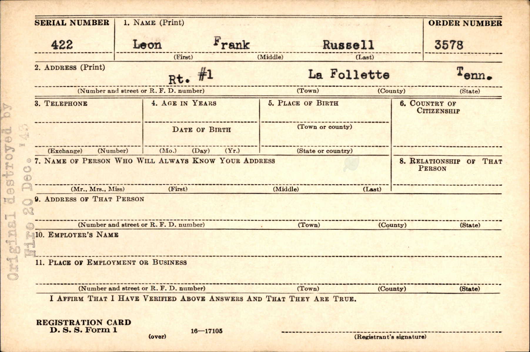 Leon Frank Russell was born on 15 March 1913, the son of Elbert Barton Russell and Loretta “Lora” Keller.