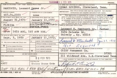 Leonard Hayes Mantooth Jr. was the son of Leonard H. and Loraine P. Mantooth. He was killed in action when the helicopter he was riding in was shot down over South Vietnam. He was a helicopter gunner.