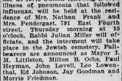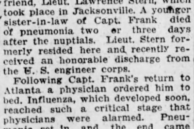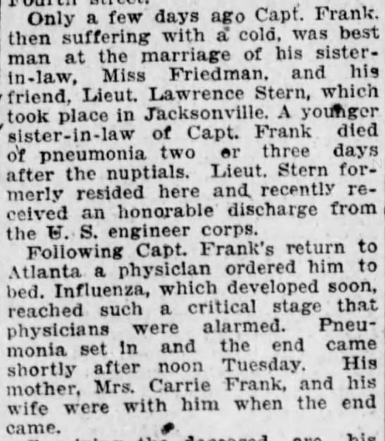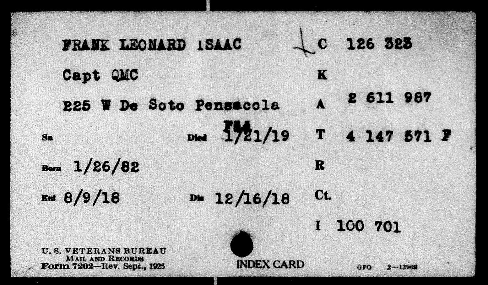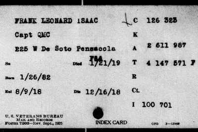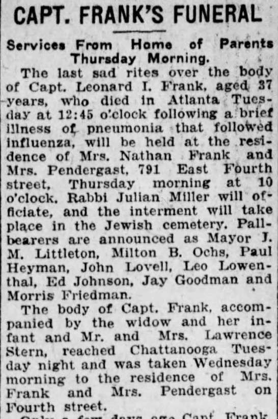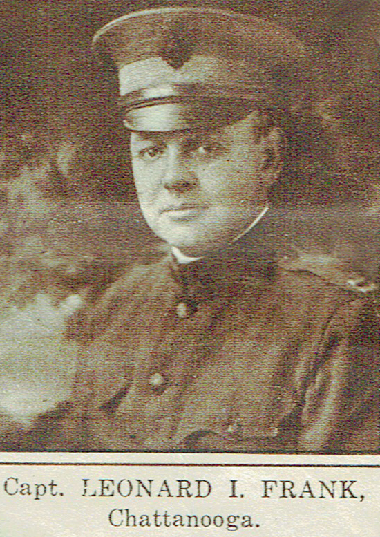 Leonard Isaac Frank was born in 1882 in Chattanooga, Tennessee to Nathan and Carrie Frank. He was married to Miriam Friedman and father of Leonard Isaac Frank Jr. He served as a Commisioned Officer in the US Army. He died at Fort Oglethorpe, Georgia of pneumonia and influenza.