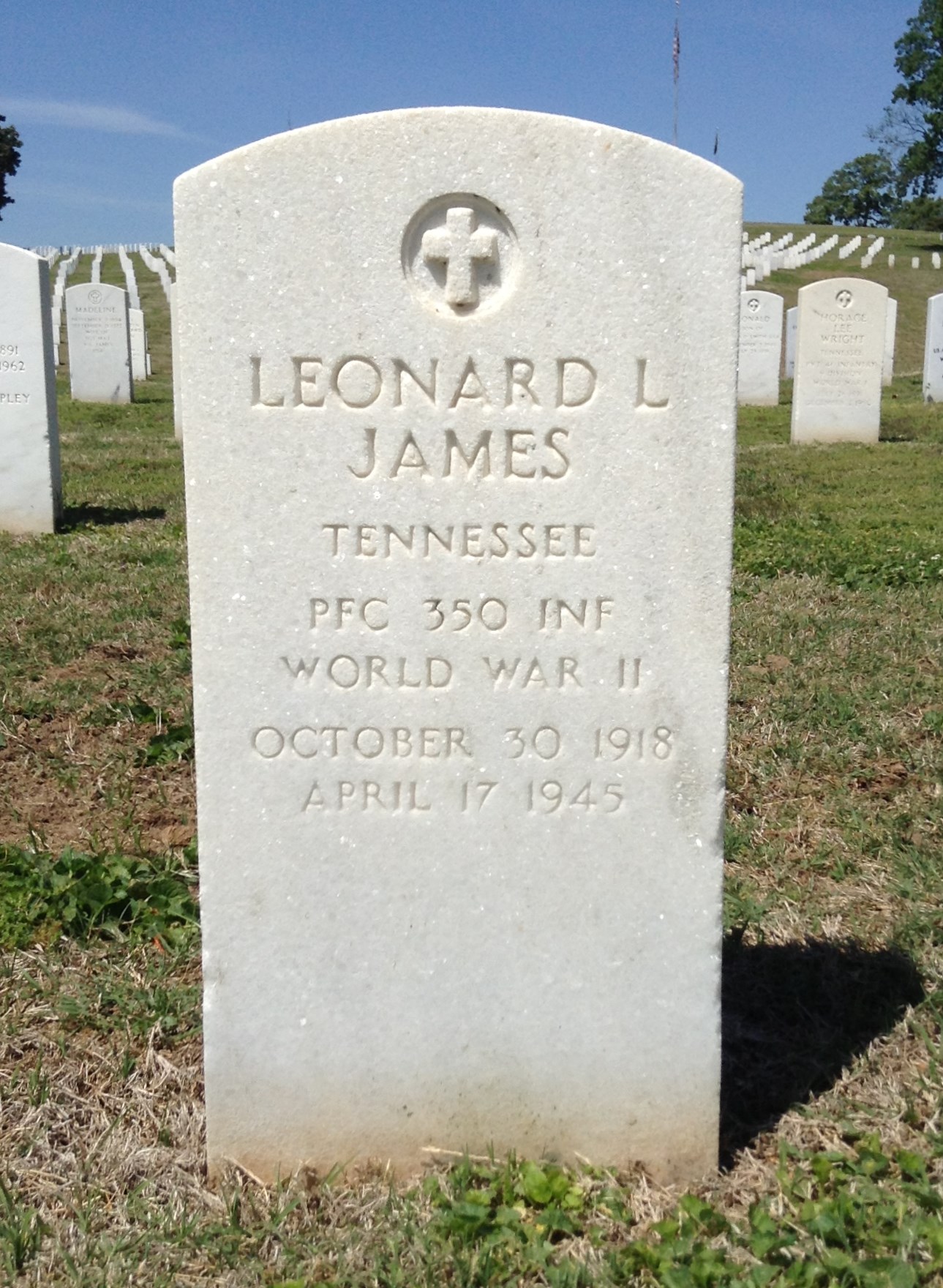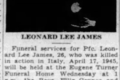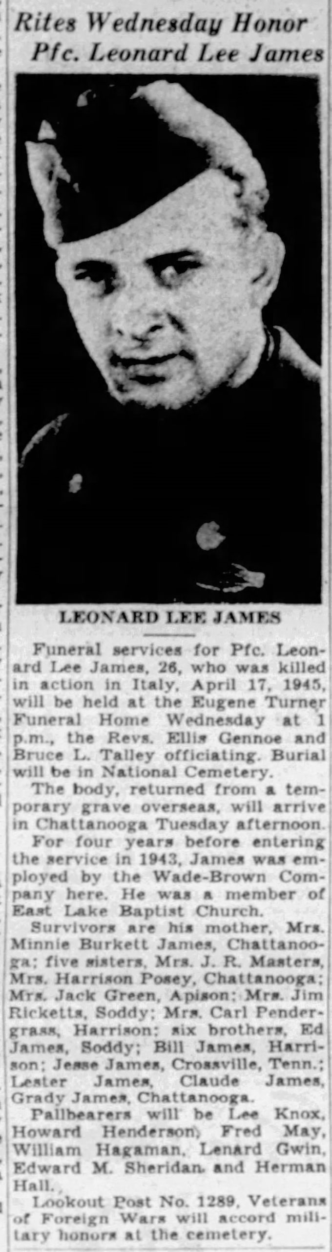 Pfc. Leonard L. James, husband of Mrs. Julia James, 1733 Foust Street, and son of Mrs. David James of Knoxville, was killed in action in Italy April 17, his wife was officially informed. A former employe of the Wade Brown Company before entering the service in 1943, he is survived by his wife, mother, six brothers, EdJames, Soddy; Sgt. Grady James, now in France; Claude James in military service; Jesse James, Knoxville; Lester James, Chattanooga, and William James of Birchwood; five sisters, Mrs. Robert Masters, Sixth Avenue; Mrs. Jack Green, Apison, Tenn.; Mrs. Carl Pendergrass, Chattanooga; Mrs. Harrison, Posey, Soddy, and Mrs. Jim Pickett of Soddy.