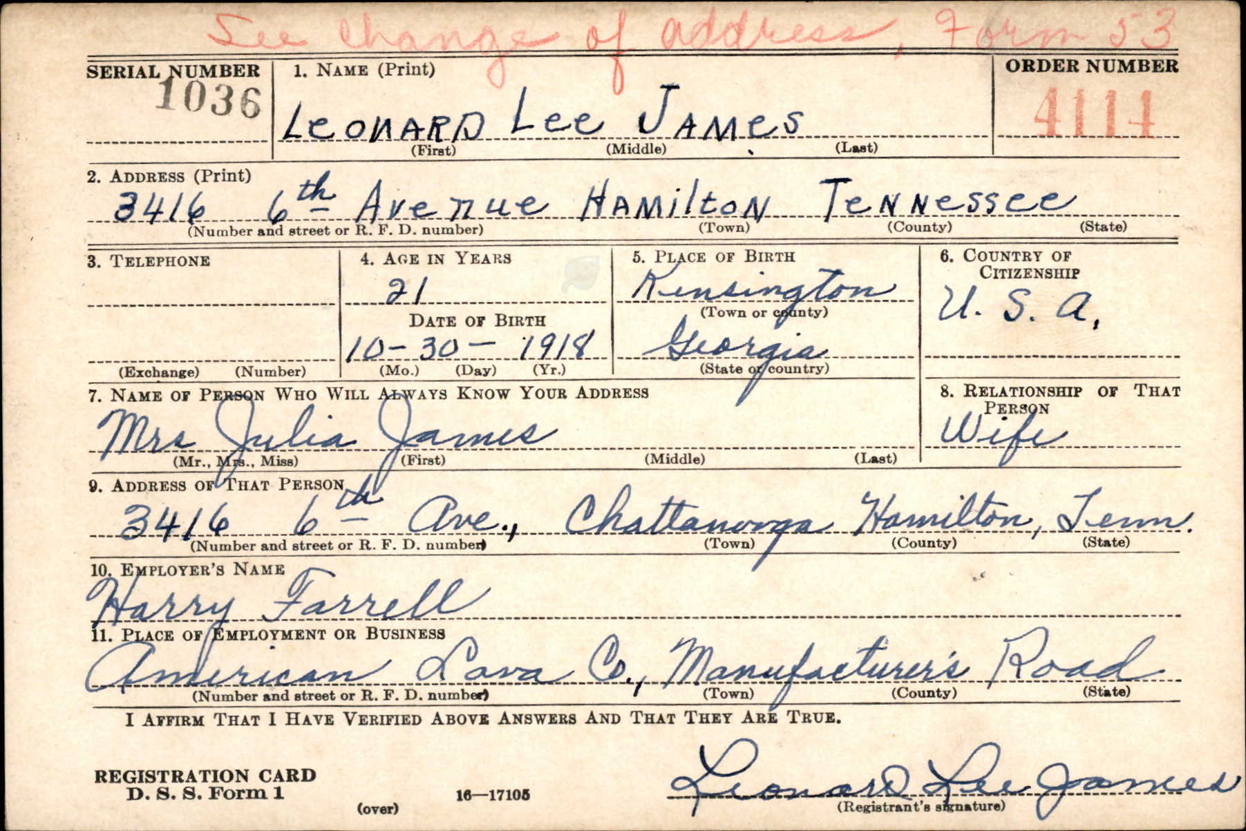 Leonard Lee James was born on 30 October 1918 at Kensington in Georgia, the son of William David James and Minnie Burkett.