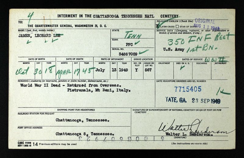 Leonard L. James was returned from Pietramala, Mt Beni, Italy. He is buried at Chattanooga National Cemetery, Section Y, Site 567