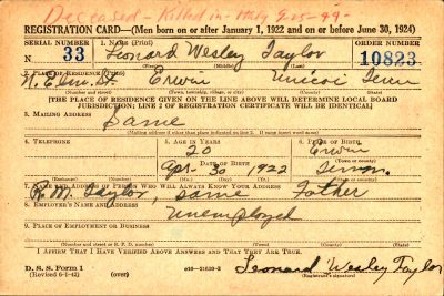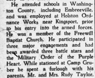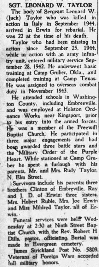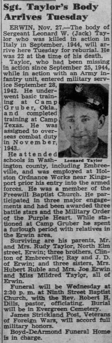 The body of Sergeant Leonard W. (Jack) Taylor, who was killed in action in Italy in September, 1944, arrived in Erwin for reburial. He was 22 at the time of his death. Taylor who had been missing in action since September 25, 1944, while in action with an army infantry unit, entered military service September 28, 1942. He underwent basic training at Camp Gruber, Okla., and completed training at Camp Texas. He was assigned to overseas combat duty in November 1943. He attended schools in Washington County, including Embreeville, and was employed at Holston Ordnance Works near Kingsport, prior to his entry into the armed forces. He was a member of the Freewill Baptist Church. He participated in three major engagements and had been awarded three battle stars and the Military Order of the Purple Heart. While stationed at Camp Gruber he spent a furlough with his parents, Mr. and Mrs. Rudy Taylor, N. Elm Street. Survivors include his parents; three sisters, Mrs. Hubert Ruble, Mrs. Joe Erwin and Miss Mildred Taylor, all of Erwin.