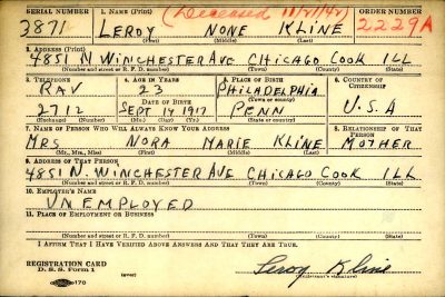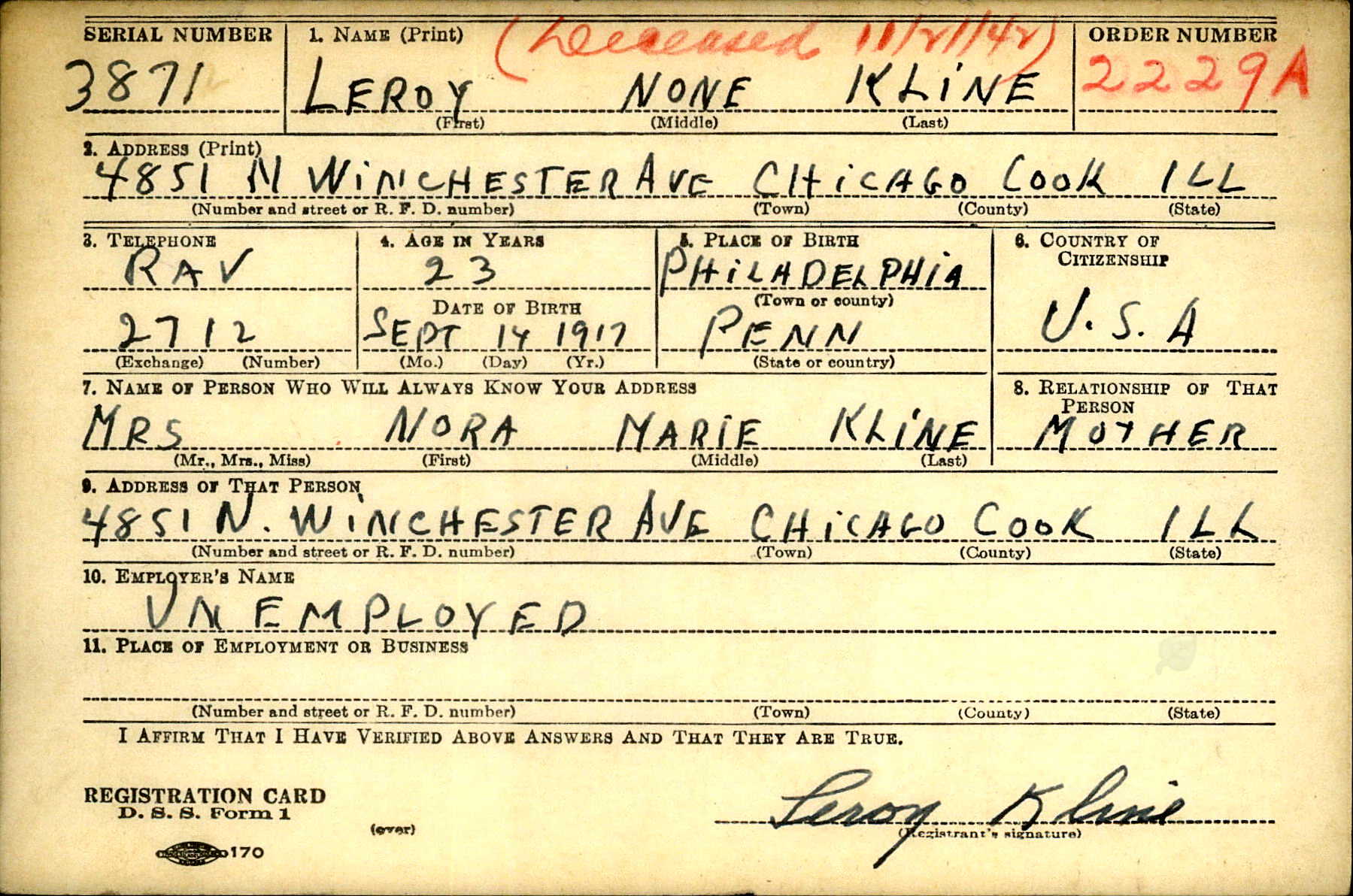 Second Lt. Leroy Kline died non battle. His service number 0-725886. Leroy Kline was born in Philadelphia, Pennsylvania, the son of Harry Kline and Nora O’Hara. He was married to Mary Ann Kline. At the time of his death he was living in Chicago, Illinois. His younger brother, Harry Allen Kline also served during World War II. He had an older sister, Eleanor Kline.