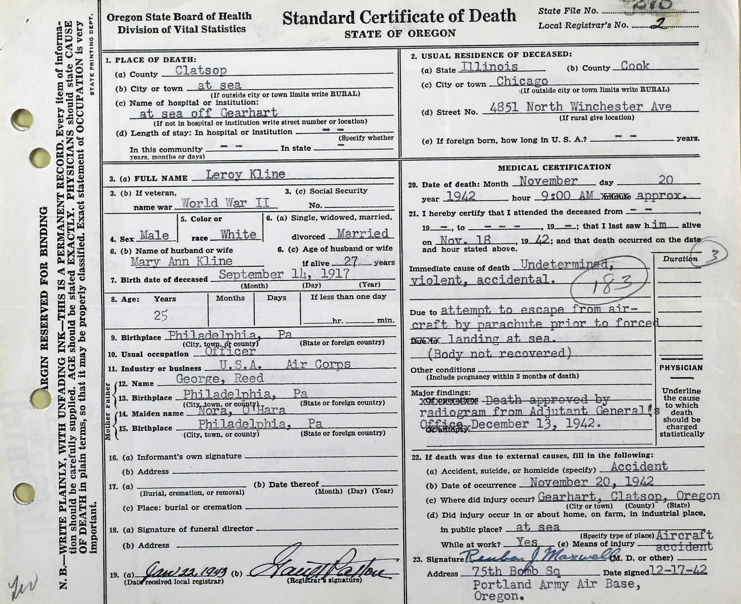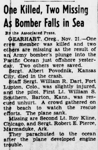 He was one of five crew members (1st Lt. William S. Southern, 2nd Lt. Leroy Kline, Sgt. Robert E. Pierce. Sgt. William R. Dart, Sgt. Albert Povodnik) of a Lockheed A-29-LO serial number 41-23323. He bailed out and went missing in the cold waters of the Pacific Ocean on 20 November 1942. He was detached at Portland AAB at Tongue Point Naval Air Station in Astoria, Oregon.