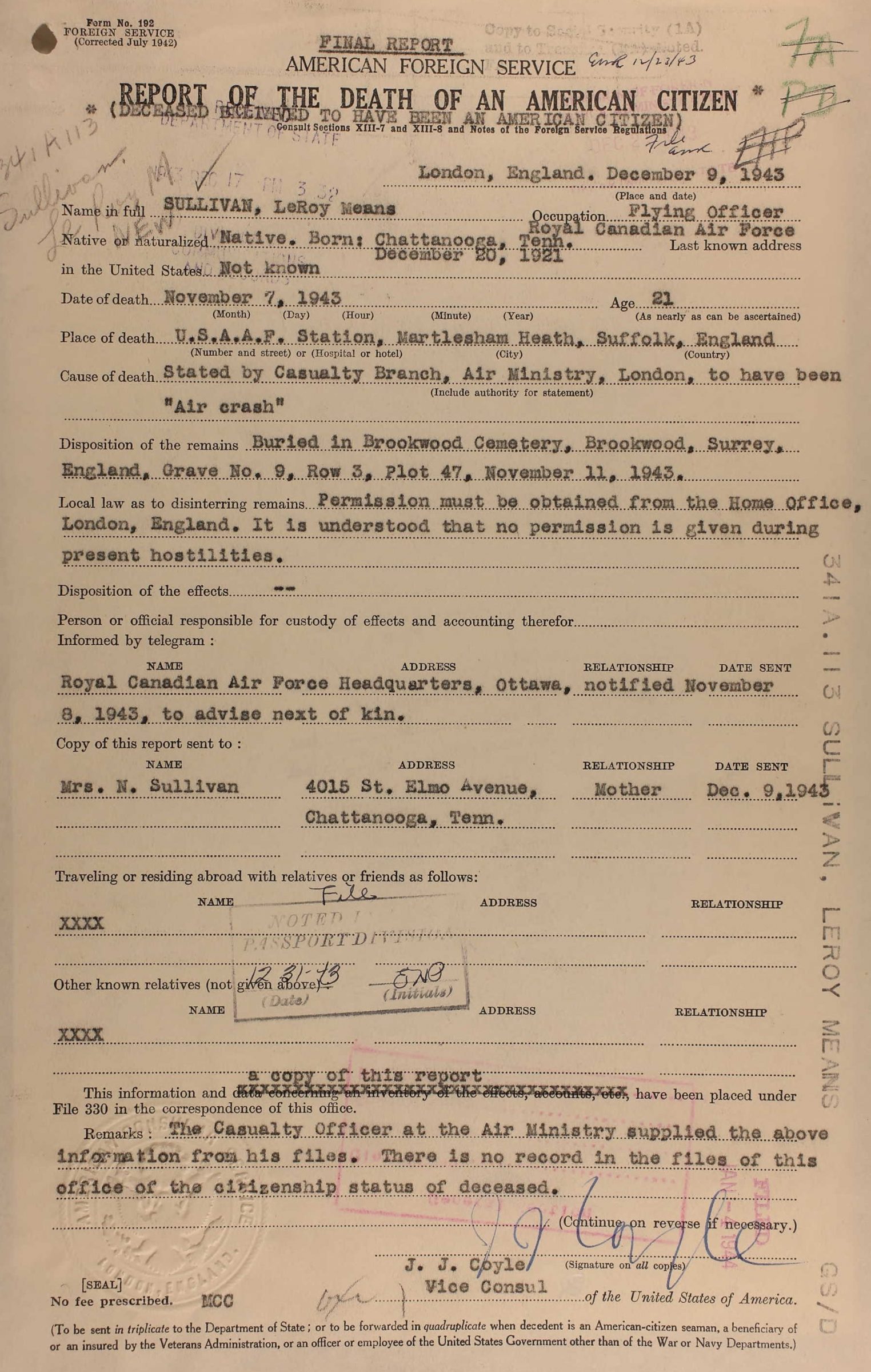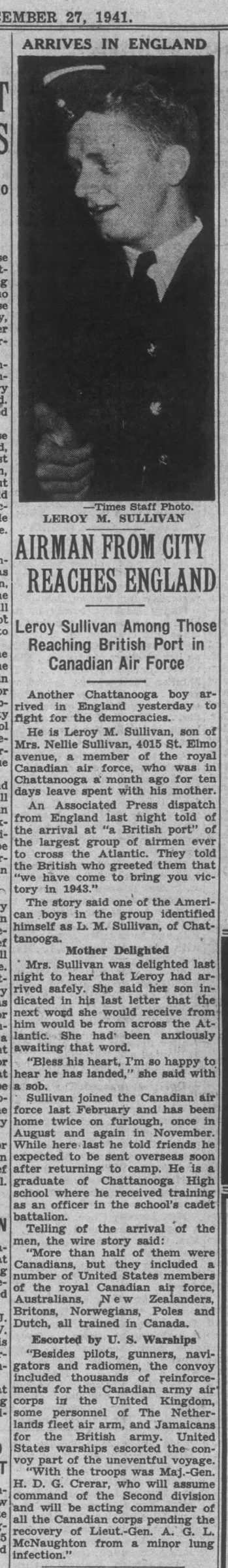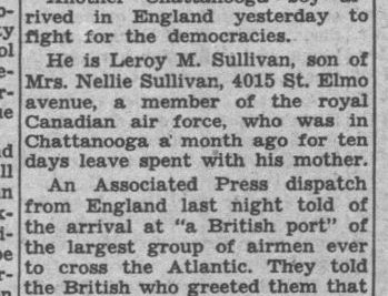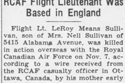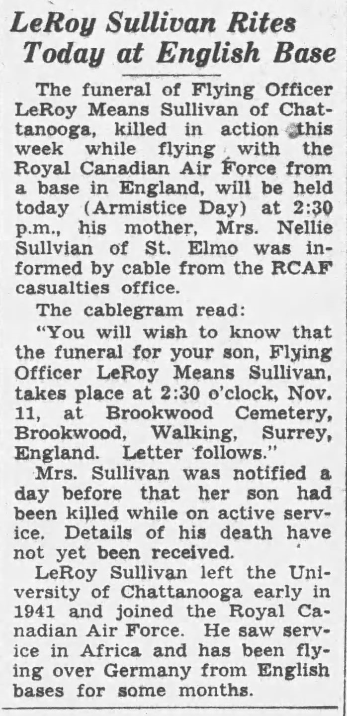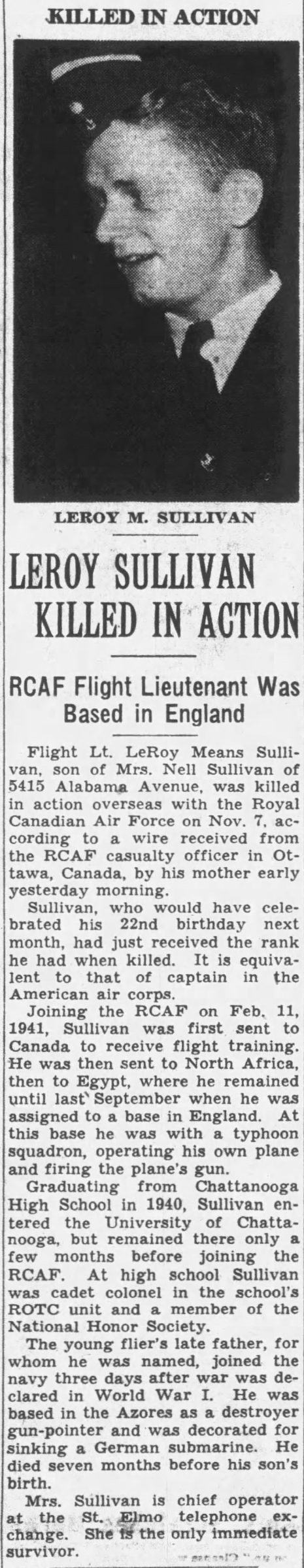 Flight Lt. LeRoy Means Sullivan, son of Mrs. Nell Sullivan of 5415 Alabama Avenue, was killed in action overseas with the Royal Canadian Air Force on Nov. 7, according to a wire received from the RCAF casualty officer in Ottawa, Canada, by his mother early yesterday morning. Sullivan, who would have celebrated his 22nd birthday next month, had just received the rank he had when killed. It is equivalent to that of captain in the American air corps. Joining the RCAF on Feb. 11, 1941, Sullivan was first sent to Canada to receive flight training. He was sent to North Africa, then to Egypt, where he remained until last September when he was assigned to a base in England. At this base he was with a typhoon squadron, operating his own plane and firing the plane’s guns. Graduating from Chattanooga High School in 1940, Sullivan entered the University of Chattanooga but remained there only a few months before joining the RCAF. At high school Sullivan was cadet colonel in the school’s ROTC unit and a member of the National Honor Society. The young flier’s late father, for whom he was named, joined the navy three days after war was declared in World War I. He was based in the Azores as a destroyer gun-pointer and was decorated for sinking a German submarine. He died seven months before his son’s birth. Mrs. Sullivan is chief operator at the St. Elmo telephone exchange. She is the only immediate survivor.
