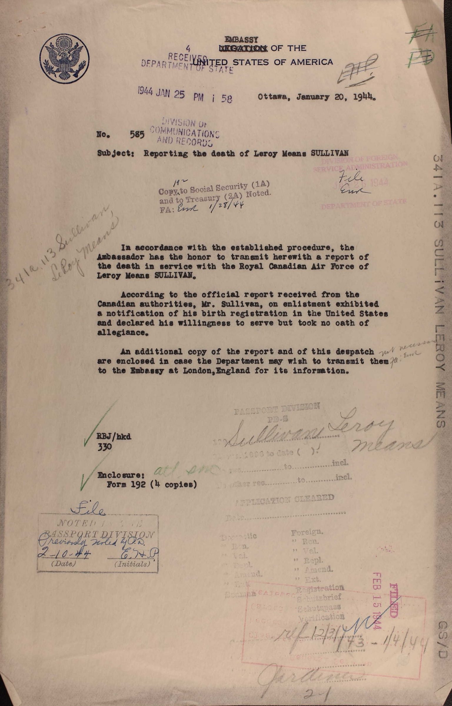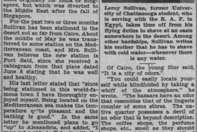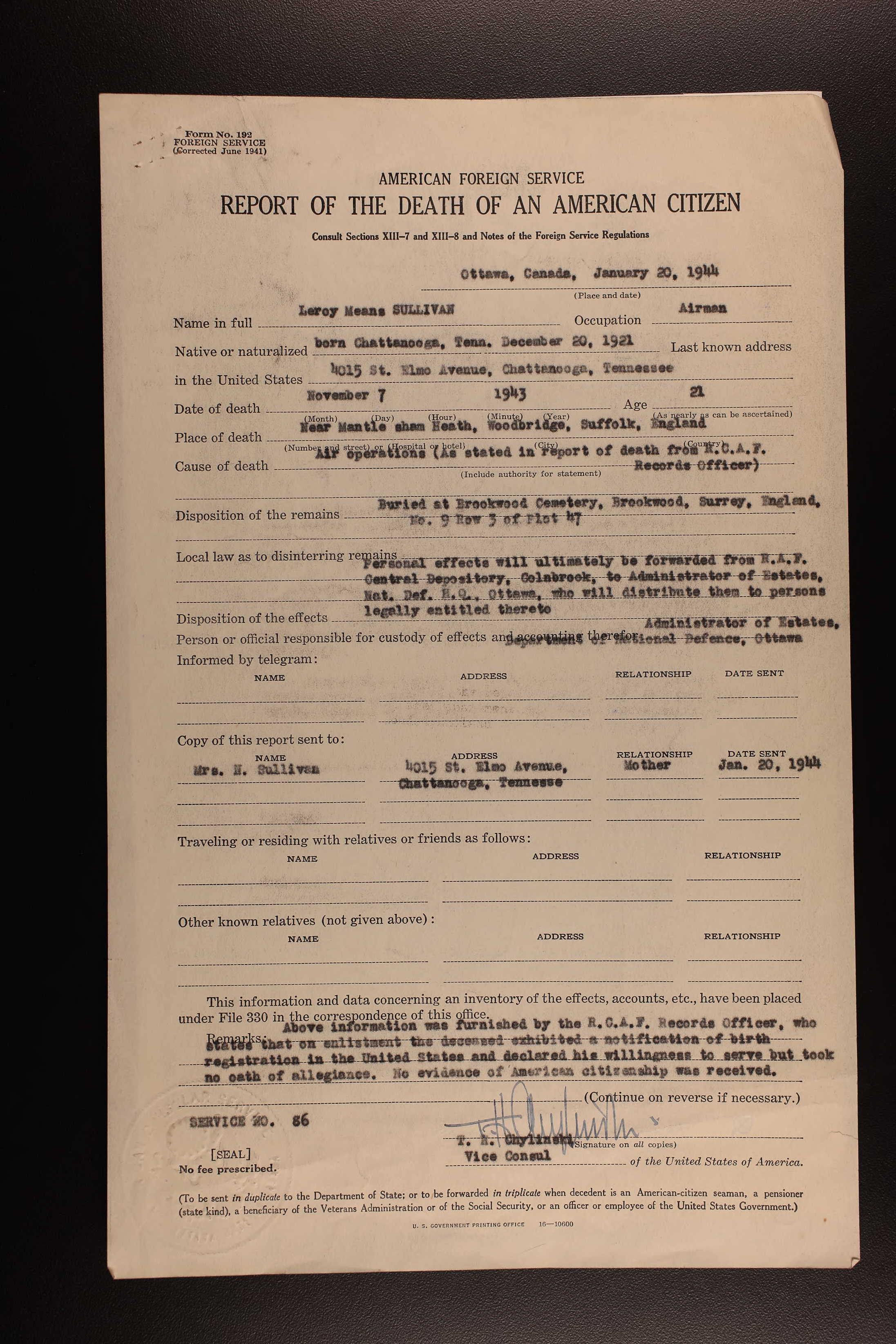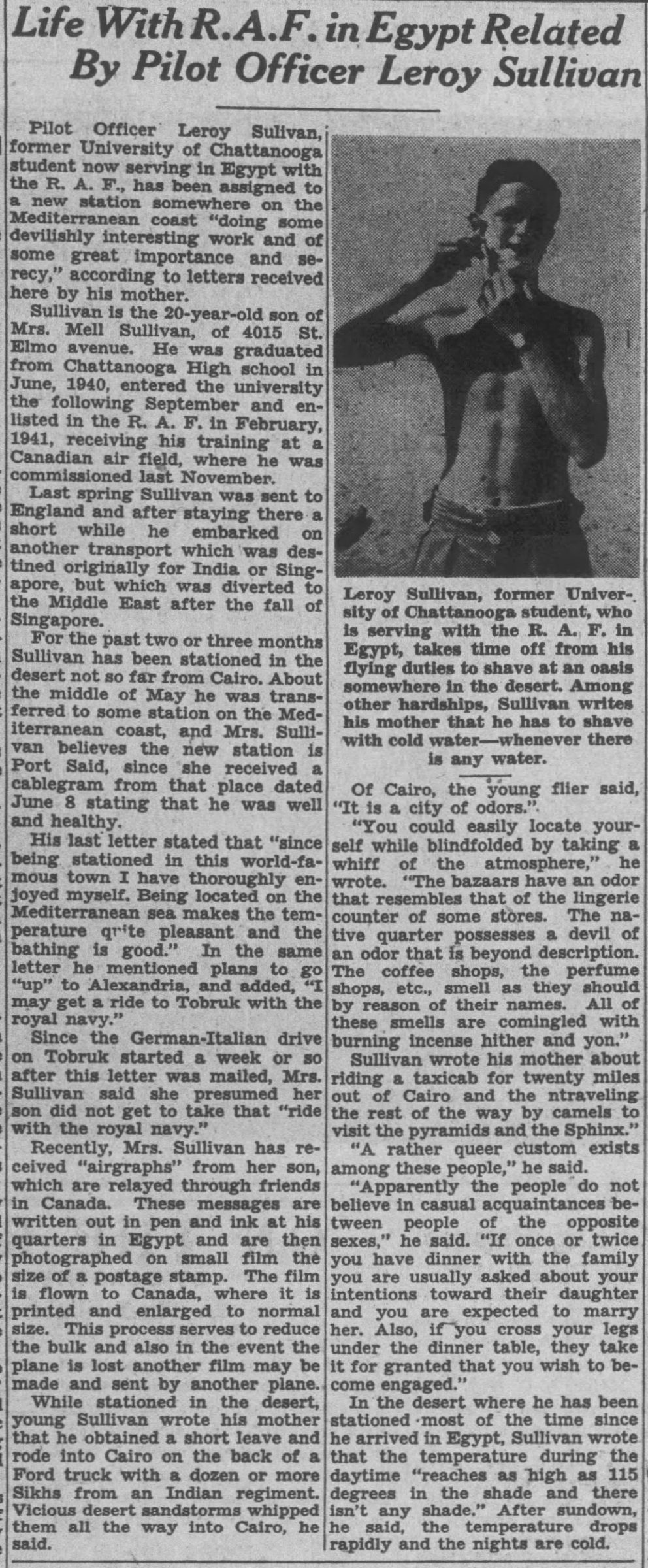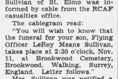 Flight Lt. LeRoy Means Sullivan, son of Mrs. Nell Sullivan of 5415 Alabama Avenue, was killed in action overseas with the Royal Canadian Air Force on Nov. 7, according to a wire received from the RCAF casualty officer in Ottawa, Canada, by his mother early yesterday morning. Sullivan, who would have celebrated his 22nd birthday next month, had just received the rank he had when killed. It is equivalent to that of captain in the American air corps. Joining the RCAF on Feb. 11, 1941, Sullivan was first sent to Canada to receive flight training. He was sent to North Africa, then to Egypt, where he remained until last September when he was assigned to a base in England. At this base he was with a typhoon squadron, operating his own plane and firing the plane’s guns. Graduating from Chattanooga High School in 1940, Sullivan entered the University of Chattanooga but remained there only a few months before joining the RCAF. At high school Sullivan was cadet colonel in the school’s ROTC unit and a member of the National Honor Society. The young flier’s late father, for whom he was named, joined the navy three days after war was declared in World War I. He was based in the Azores as a destroyer gun-pointer and was decorated for sinking a German submarine. He died seven months before his son’s birth. Mrs. Sullivan is chief operator at the St. Elmo telephone exchange. She is the only immediate survivor.