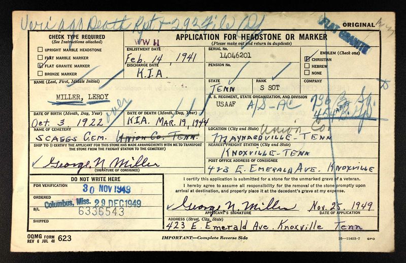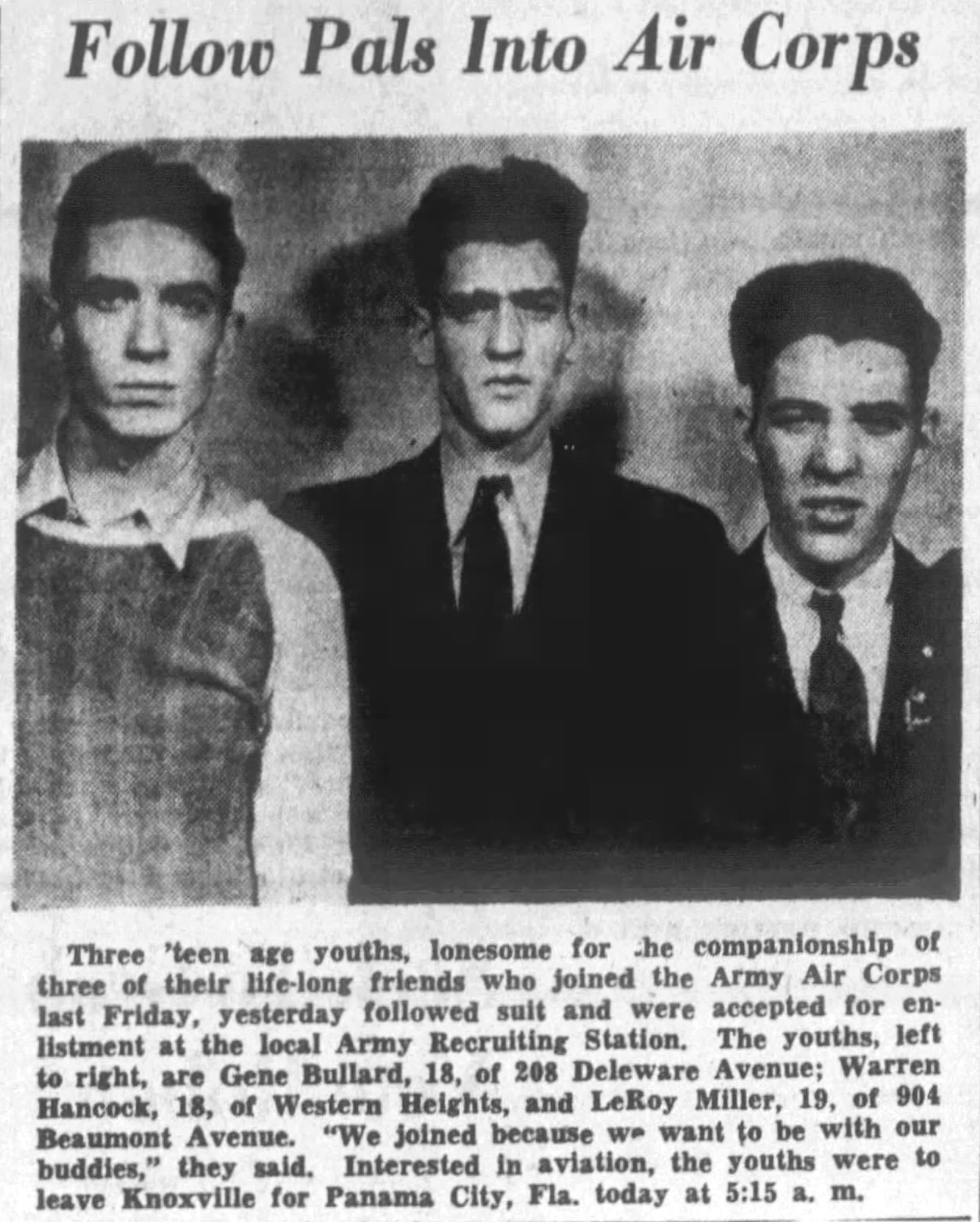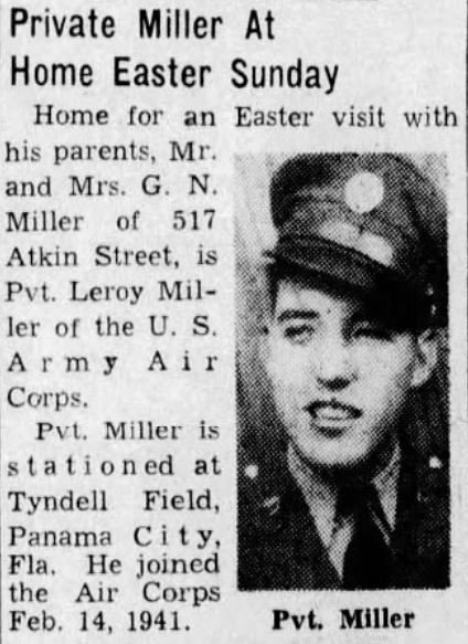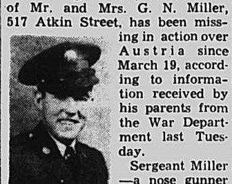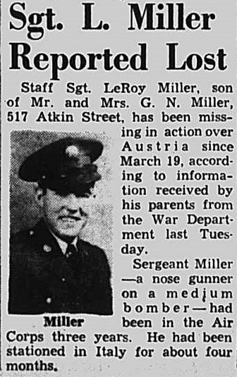 Staff Sgt. LeRoy Miller, son of Mr. and Mrs. G.N. Miller, 517 Atkin Street, has been missing in action over Austria, since March 19, according to information received by his parents from the War Department last Tuesday. Sergeant Miller – a nose gunnero n a medium bomber – had been in the Air Corps three years. He had been stationed in Italy fora bout four months.